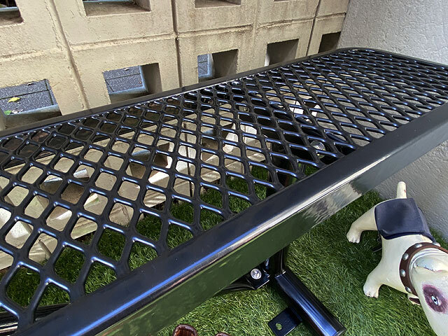 向こうに行くと見かけるスチール製のゴツいパークベンチを完全再現した屋外対応のベンチシートです。