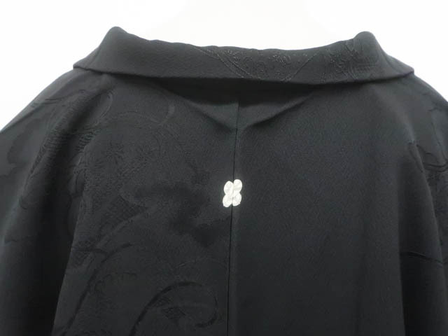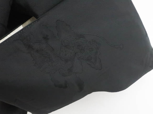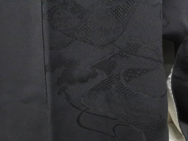 リサイクル商品のため、右後身頃の下部に薄汚れ、羽裏にシミがございますが着用可能なお品です。 地色は黒です。 1枚目の画像が近いお色かと思われます。 素材は正絹です。 |