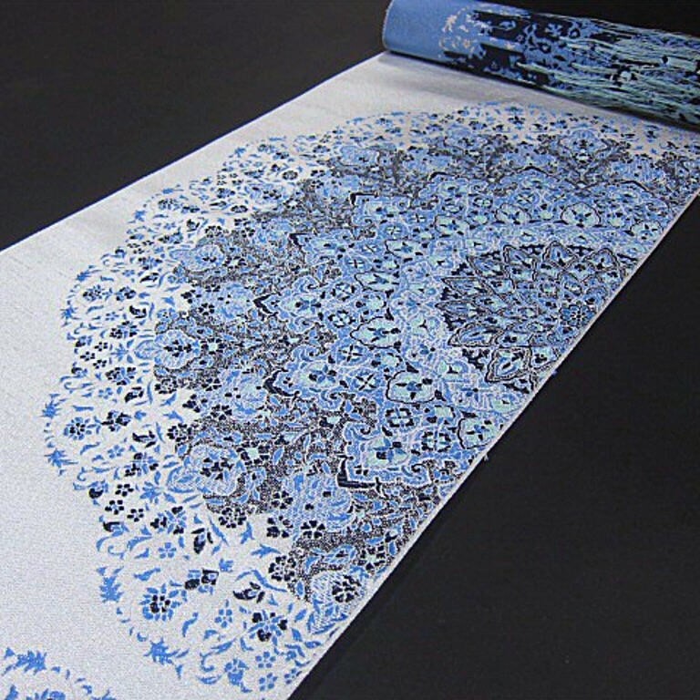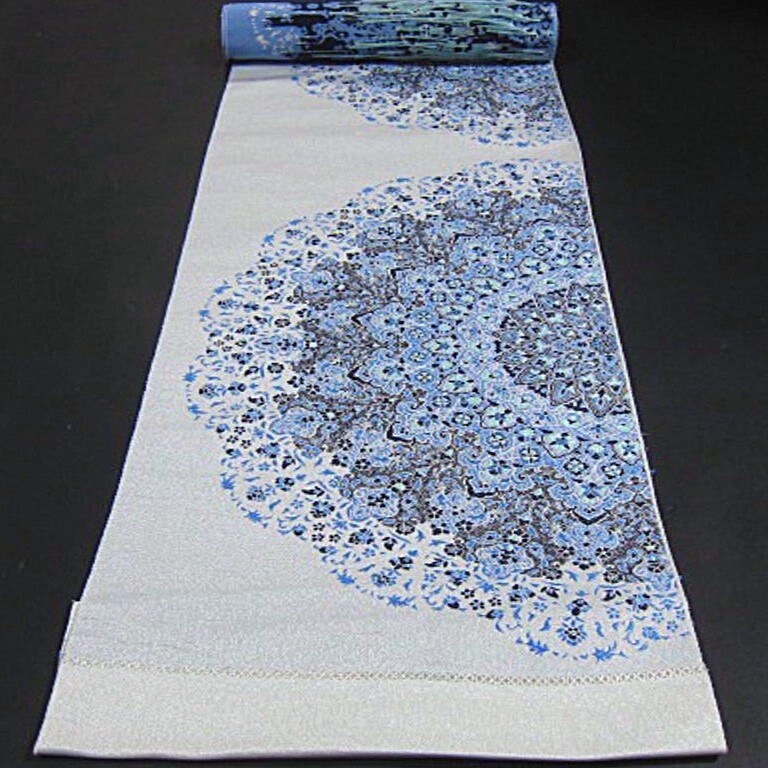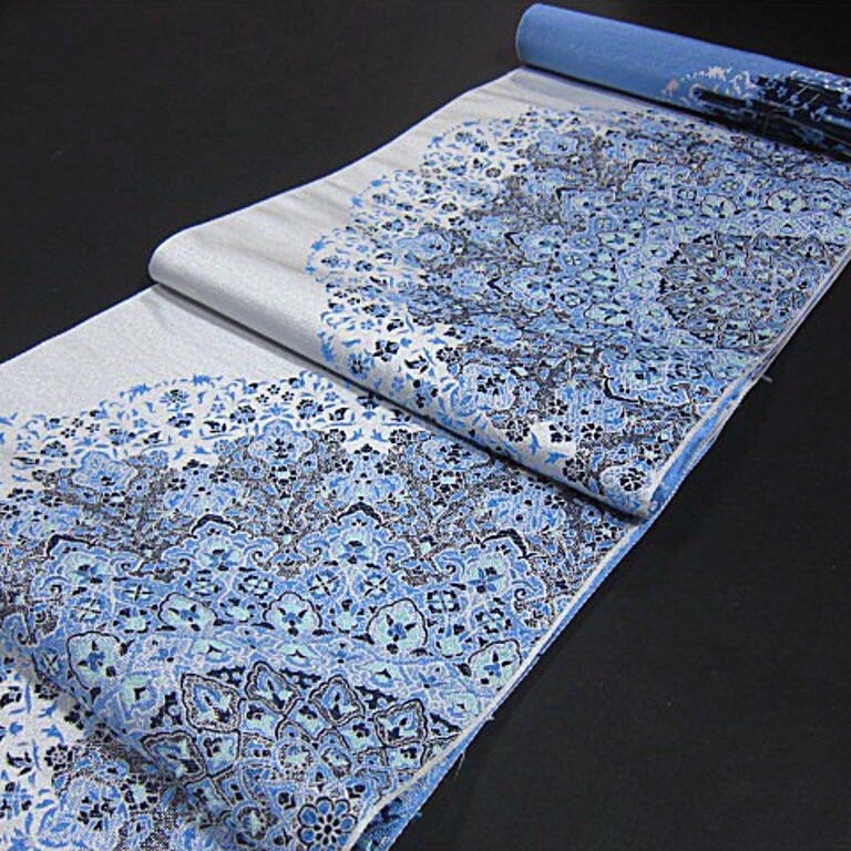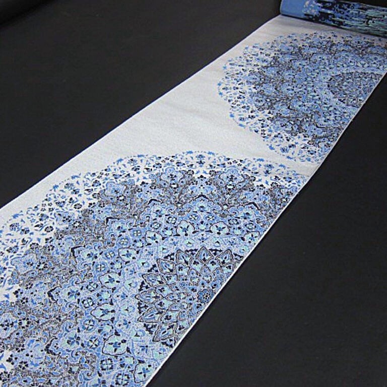 新品未仕立  西陣織丸巻六通柄袋帯です。『17世紀 サファーヴィ朝の王は高原のオアシス都市イスファハンへ、政治・文化・経済を集中した王都を建設しました。人は、その繁栄を世界の半分を評し、その美しさをイスラムの真珠と讃えました。この帯では、イスファハンの象徴的建造物で世界遺産のイマール広場のモスクをモチーフに創作しました。美しい造形を織組織で再現し、トルコブルーの深い色合いを藍染にて表現しています。