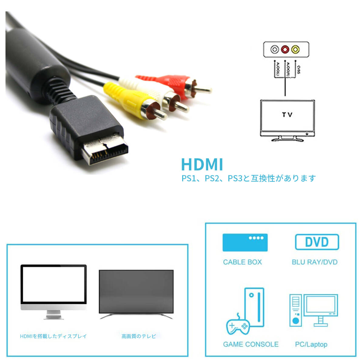 | 使用説明書 | 1.PSシリーズ本体のAV MULTI OUTポートに、本体のAVプラグに対応するケーブルを差し込む 2.ケーブルの反対側の黄色いプラグを、ディスプレイ機器のビデオ入力に差し込む 3.残りの赤白2本のプラグを、オーディオ機器の左右のチャンネル入力穴に差し込む 4.ホストとAV機器の電源を入れ、ゲーム機能を有効にする |