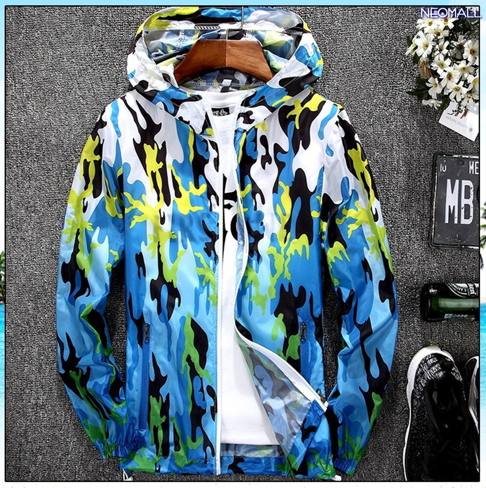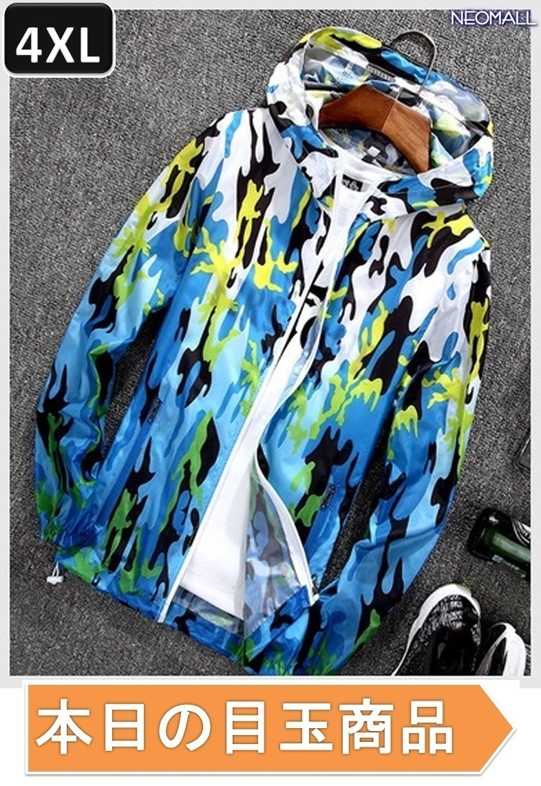 本日の目玉 【372】 ウィンドブレーカー フード付き ブルー 4XL メンズ ナイロン カモフラ 柄 アウトドア 防風 軽量 ジャケット