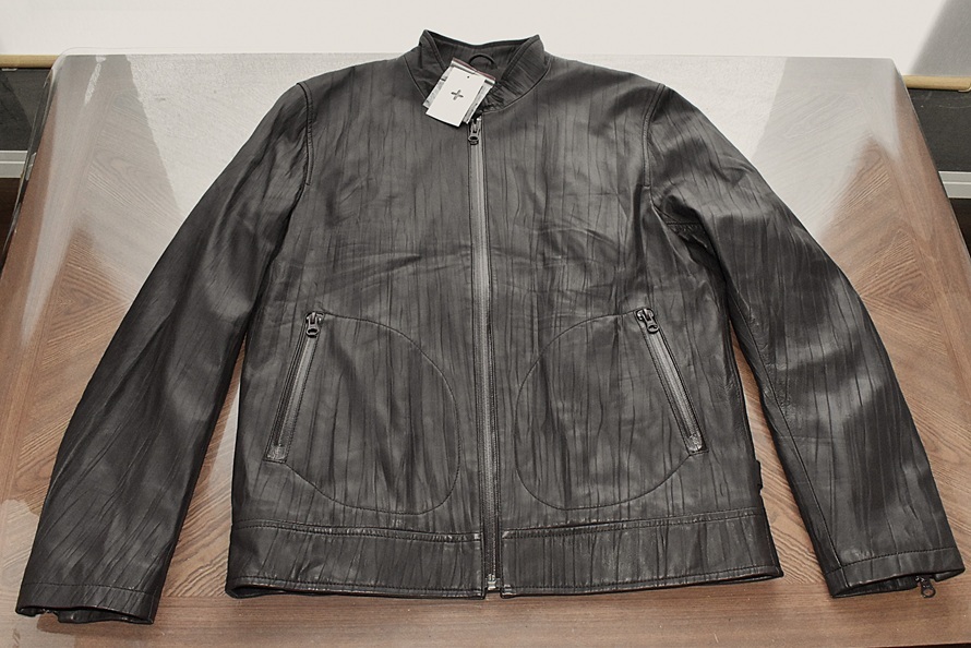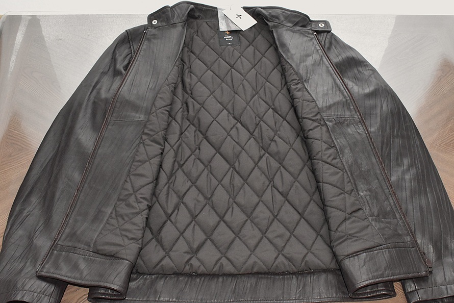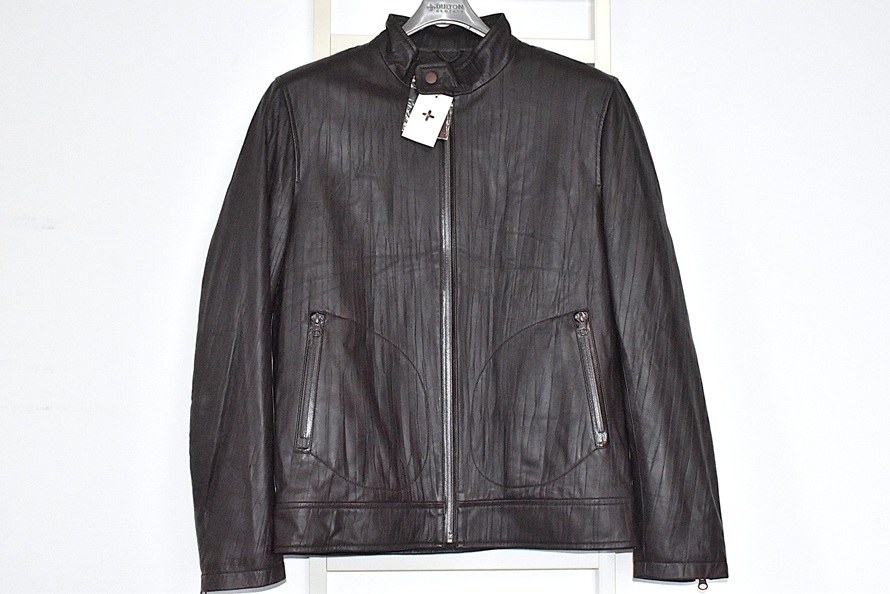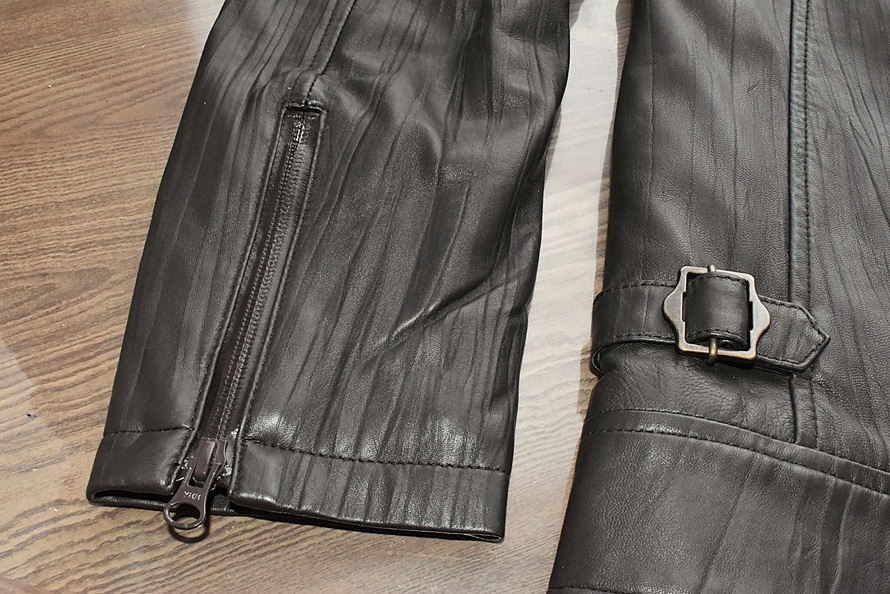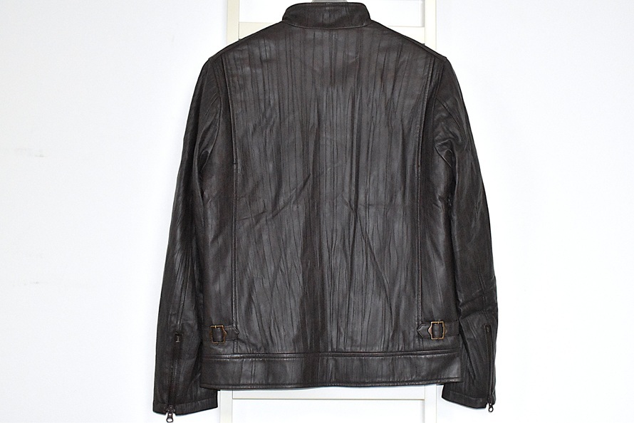 レザー表面に は、デニムの“縦落ち”を思わせる縦方向のライン(ストリーク) がしっかり入っていますが、おそらくは熱プレスによるクリンクル加工(シワ加工)で、ナチュラルな風合いを残しながらも、独特の立体感とモードな表情を引き出す、非常に魅力的なデザインで、このジャケットのポイントにもなっています。