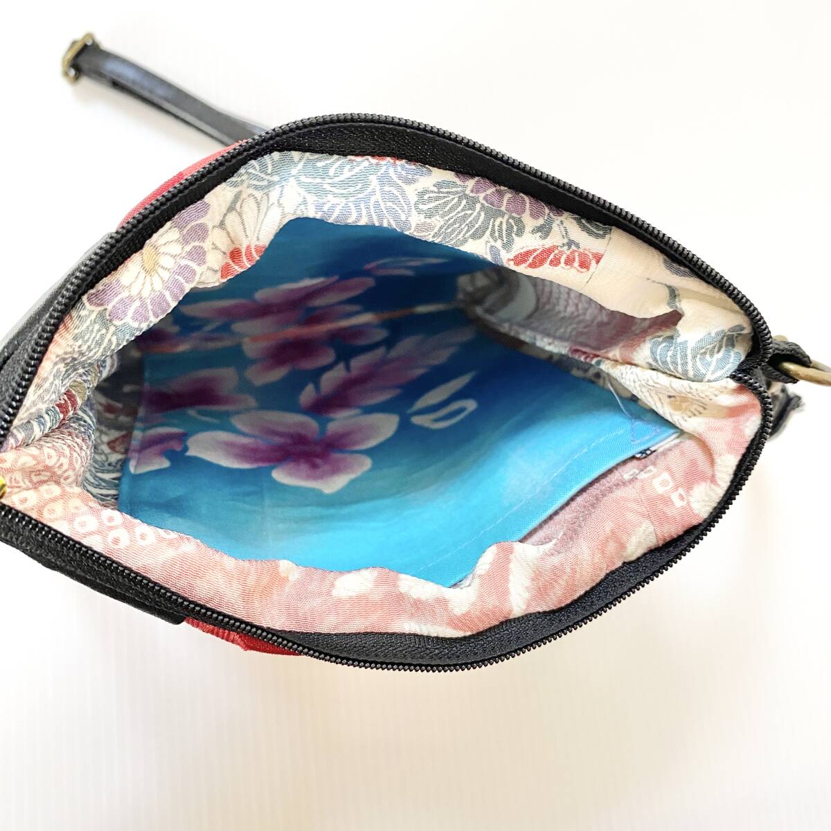 内ポケット2つありますので、携帯・カギなど細々したものの収納も抜群なサコッシュバッグ、スマホショルダーです。ポケット生地は可愛い着物柄!