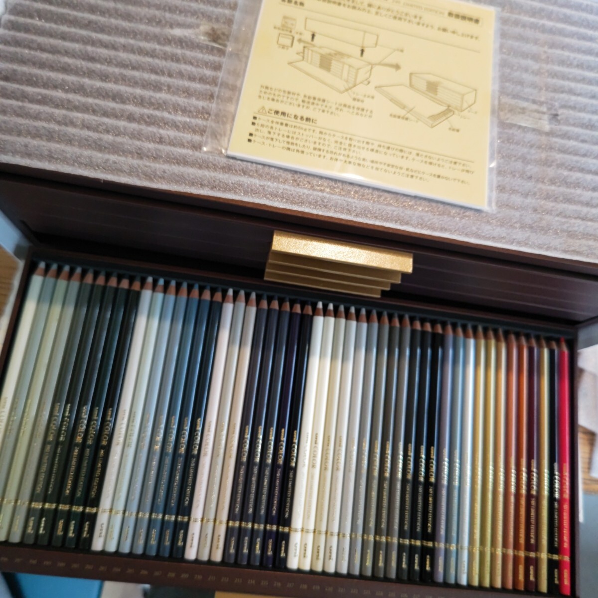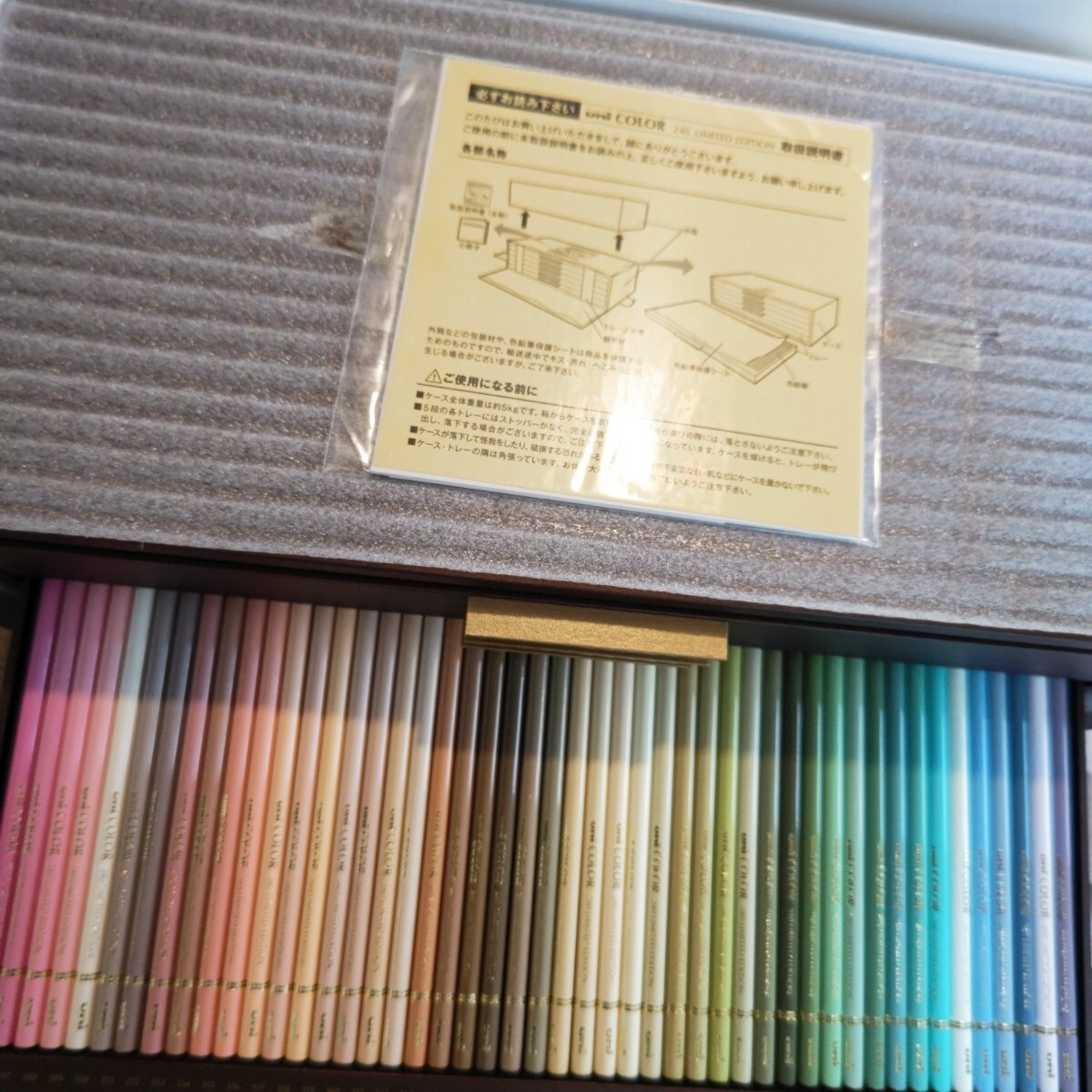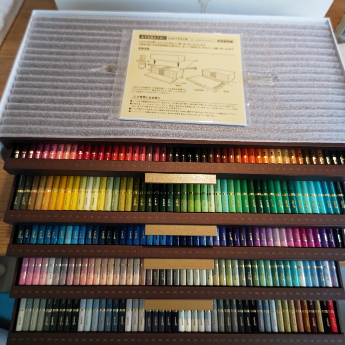 表の白い箱には汚れありますが、色鉛筆と色鉛筆ケースは未使用なので綺麗です。