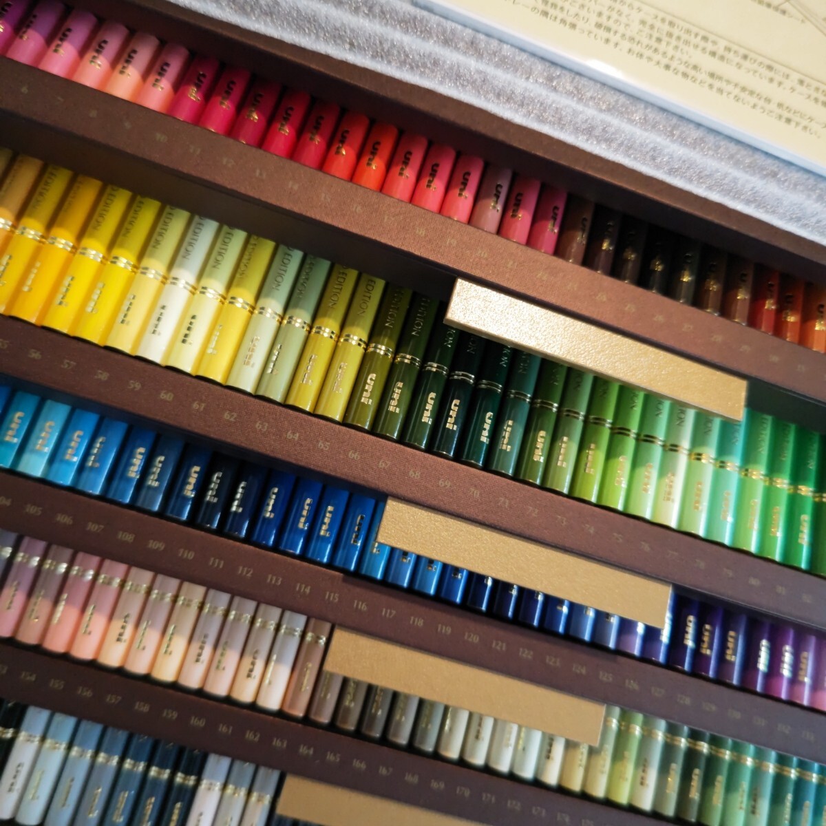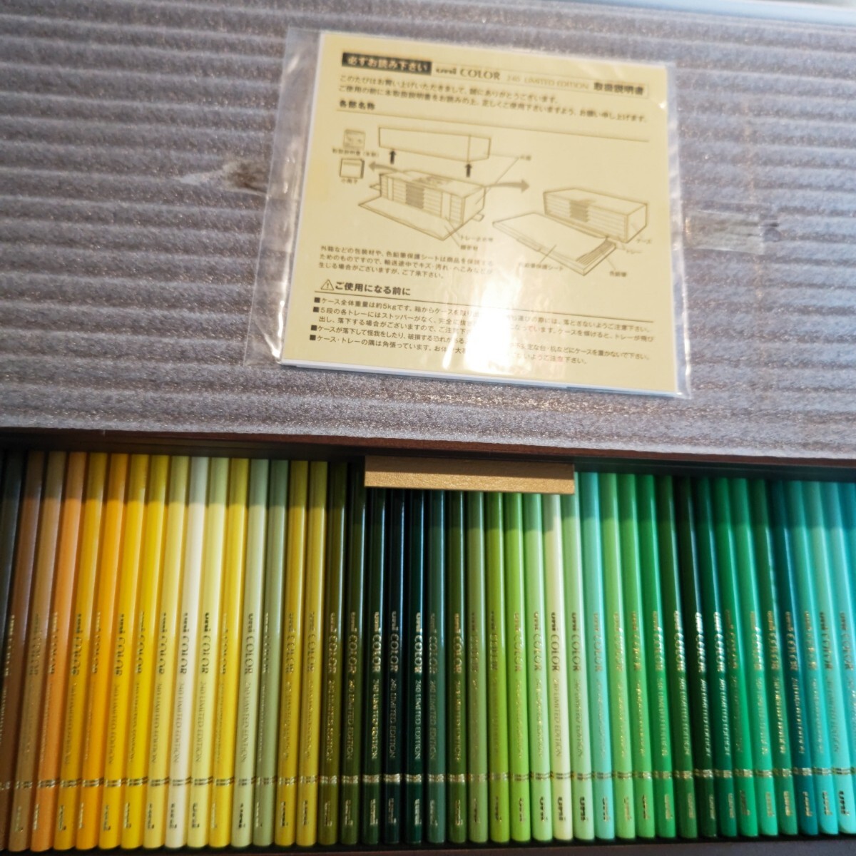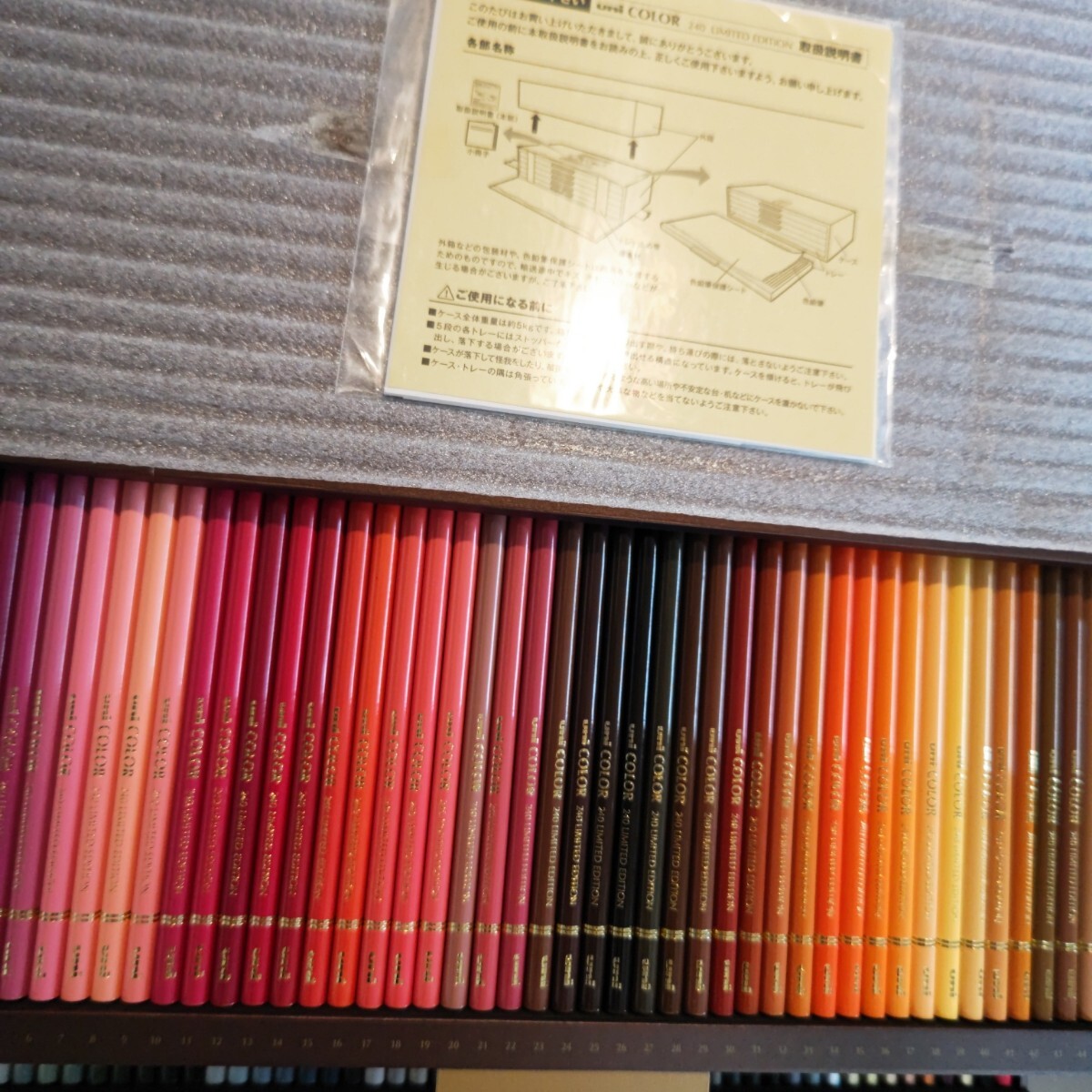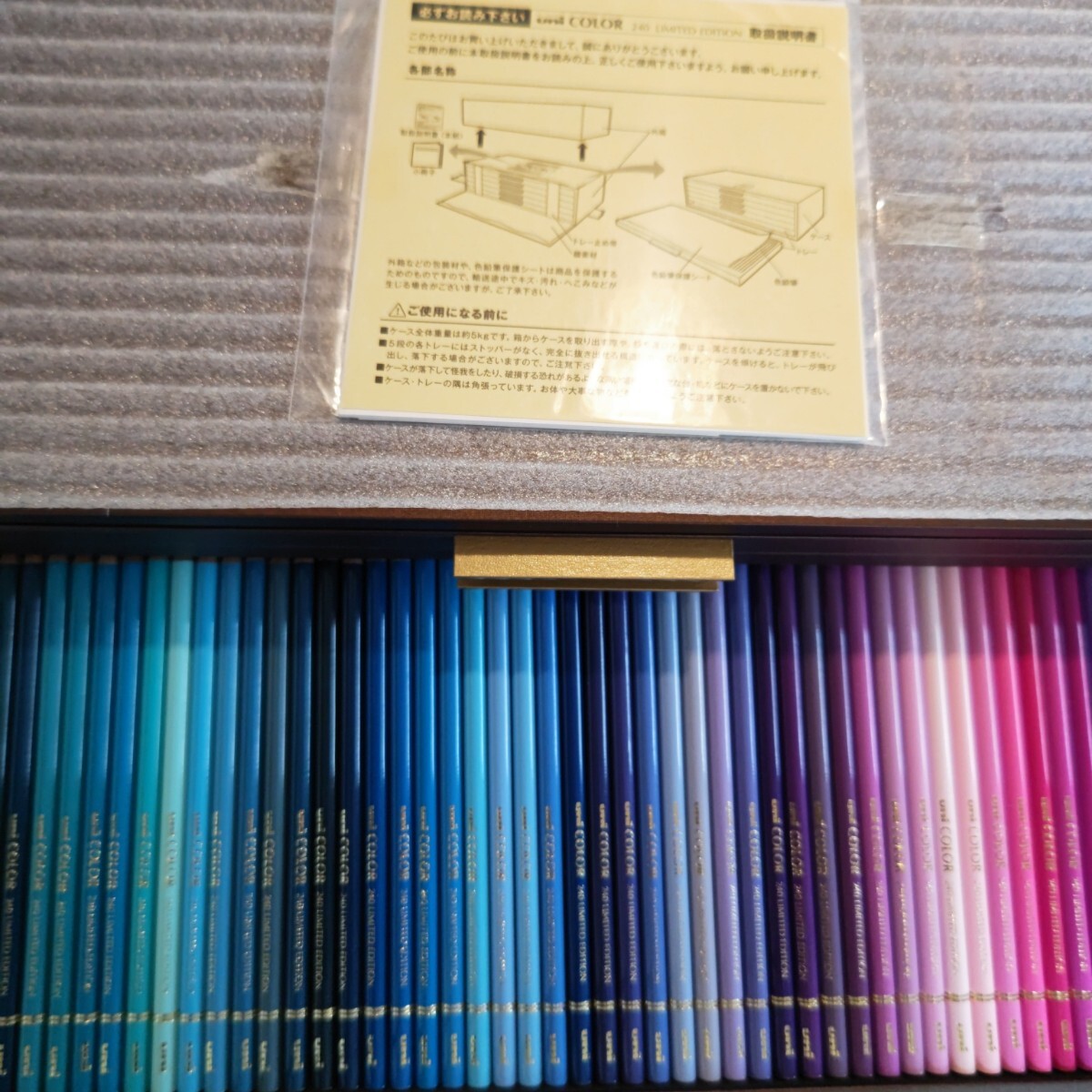 表の白い箱には汚れありますが、色鉛筆と色鉛筆ケースは未使用なので綺麗です。