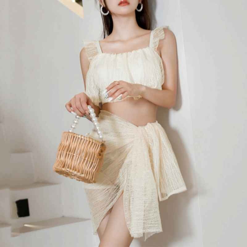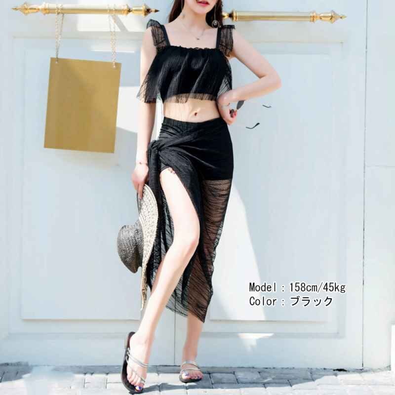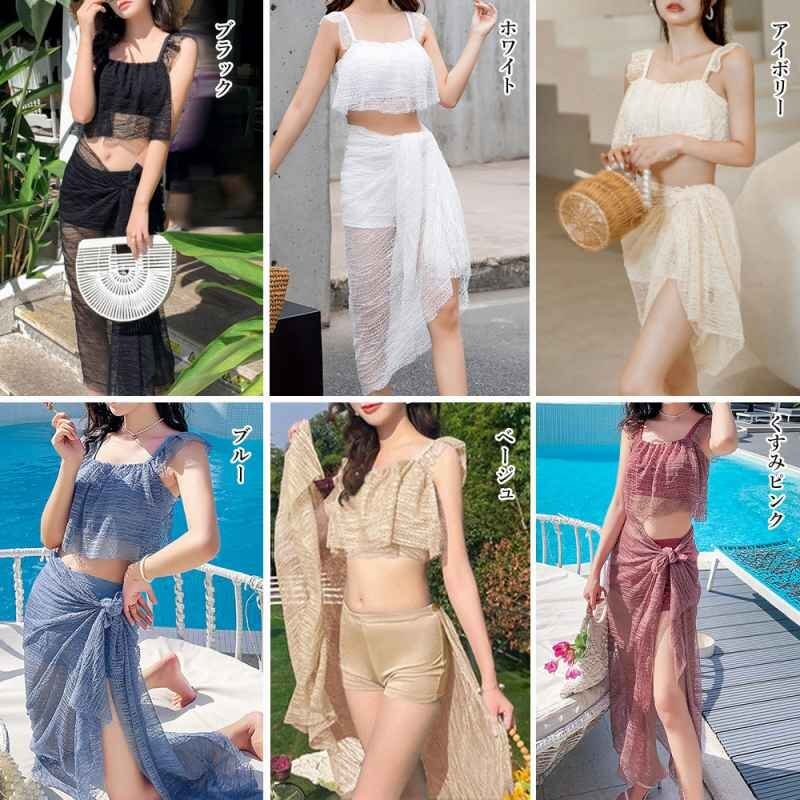 露出少なめでオシャレな巻きスカート付きのレディース水着3点セットです。
