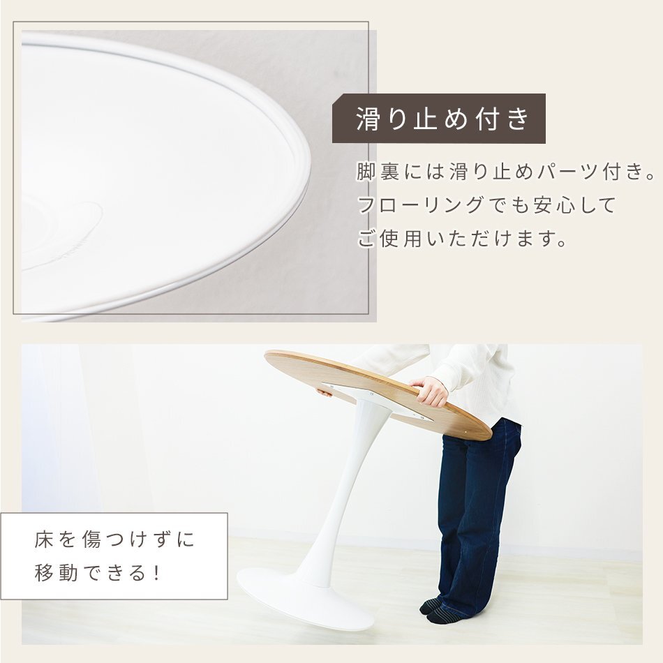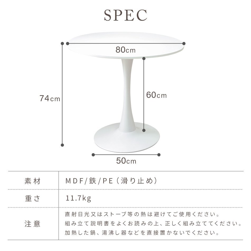 シンプルな形が美しい丸型ダイニングテーブル! シンプルだからこそ、どんなお部屋にも馴染みます。 ワンルームにもオススメ! お家にいながらおしゃれなカフェにいるかのような贅沢な時間を味わうことができます♪ 一本脚なので足元のスペースが広々。リラックスした姿勢で過ごせます。 耐久性にも優れ、頑丈なスチール脚はしっかりとテーブルを支えます。 脚裏には、滑り止めパーツ付き。床を傷つけることなく移動できます。 組立簡単!女性一人でも簡単に組み立てられます♪ 【商品仕様】 ・カラー:ホワイト ・サイズ:(約)直径80×高さ74cm ・重量:(約)11.7kg ・耐荷重:(約)150kg ・素材:MDF/鉄/PE(滑り止め) 【注意事項】 ・直射日光又はストーブ等の熱は避けてご使用ください。 ・組立て説明書をよくお読みの上、正しく組立ててください。 ・加熱した鍋、湯沸かし器などを直接置かないでください。 |