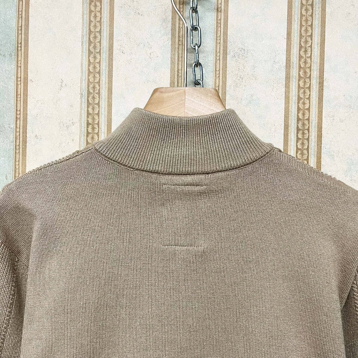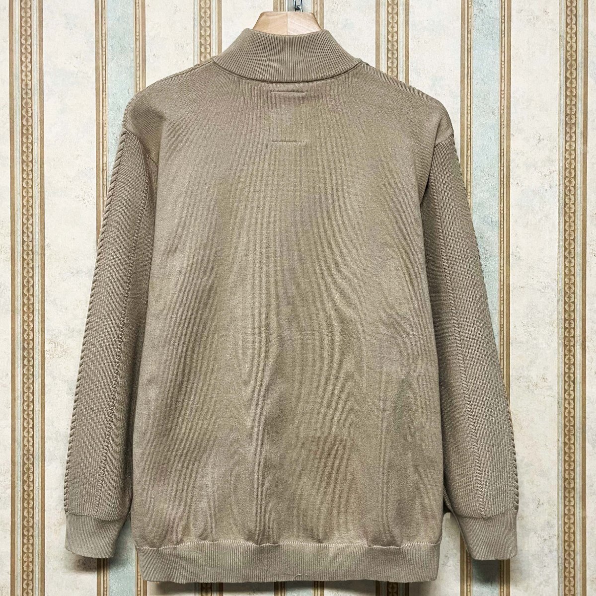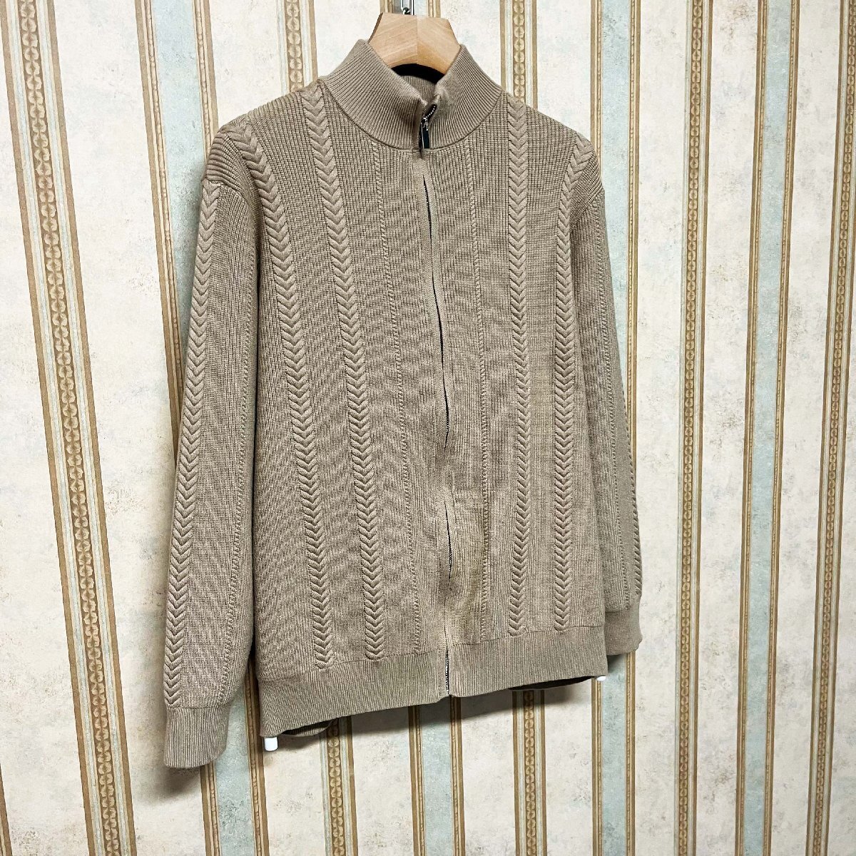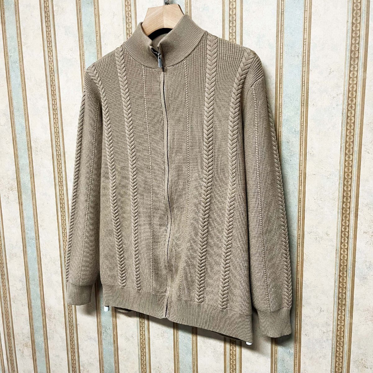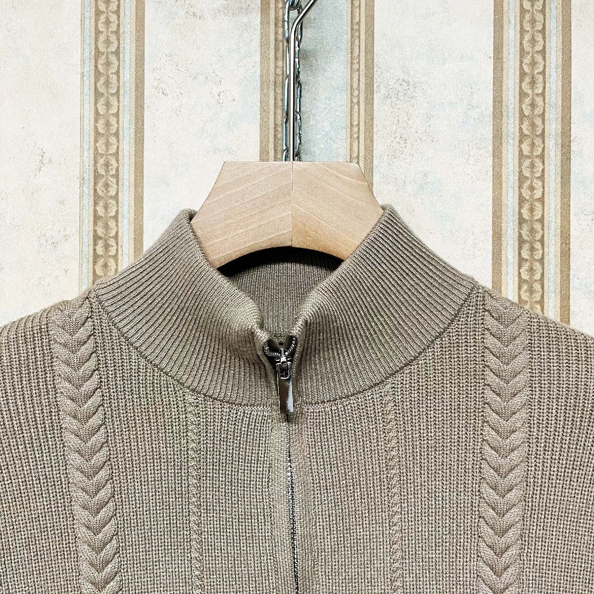細かい編み目で丁寧に作られており、ところどころに施されたケーブル編みがさりげないアクセントになっています。前面はジップ仕様で、脱ぎ着がスムーズ。首元、袖口、裾はリブ仕様になっており、冷たい風を防ぎながらもフィット感があり、快適な着心地をサポートします。