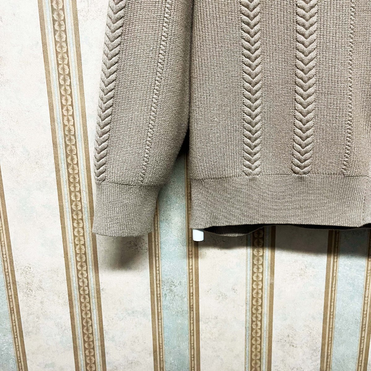 ウール混紡素材で柔らかい肌触りと暖かさを兼ね備え、春や秋の気温変化がある時期にぴったりです。適度な厚みのニット素材で肌に優しく馴染み、きめ細かい編み目が快適な着心地を提供します。