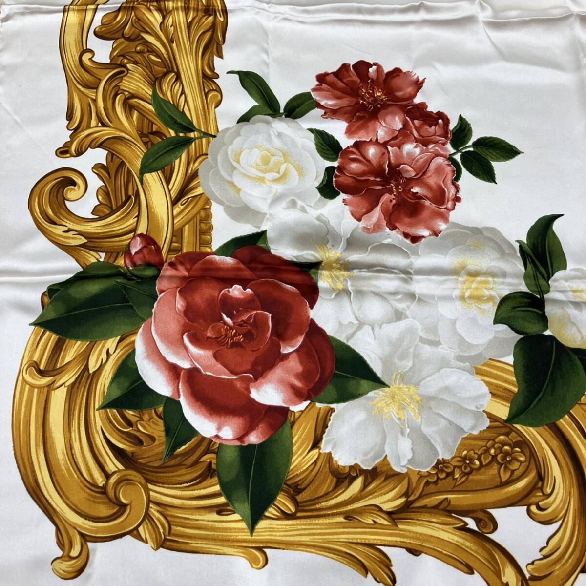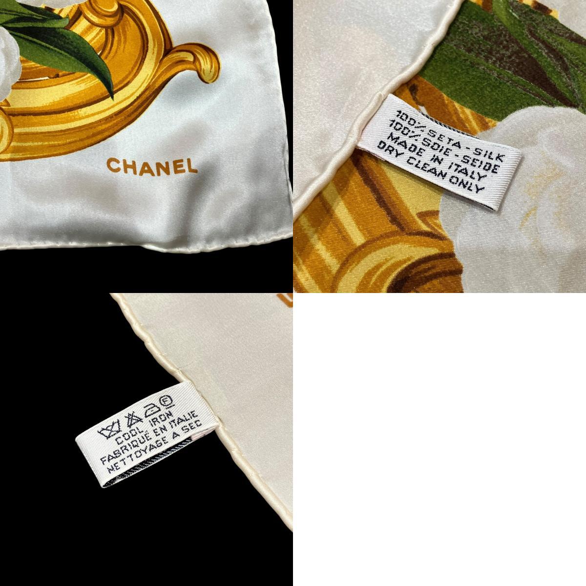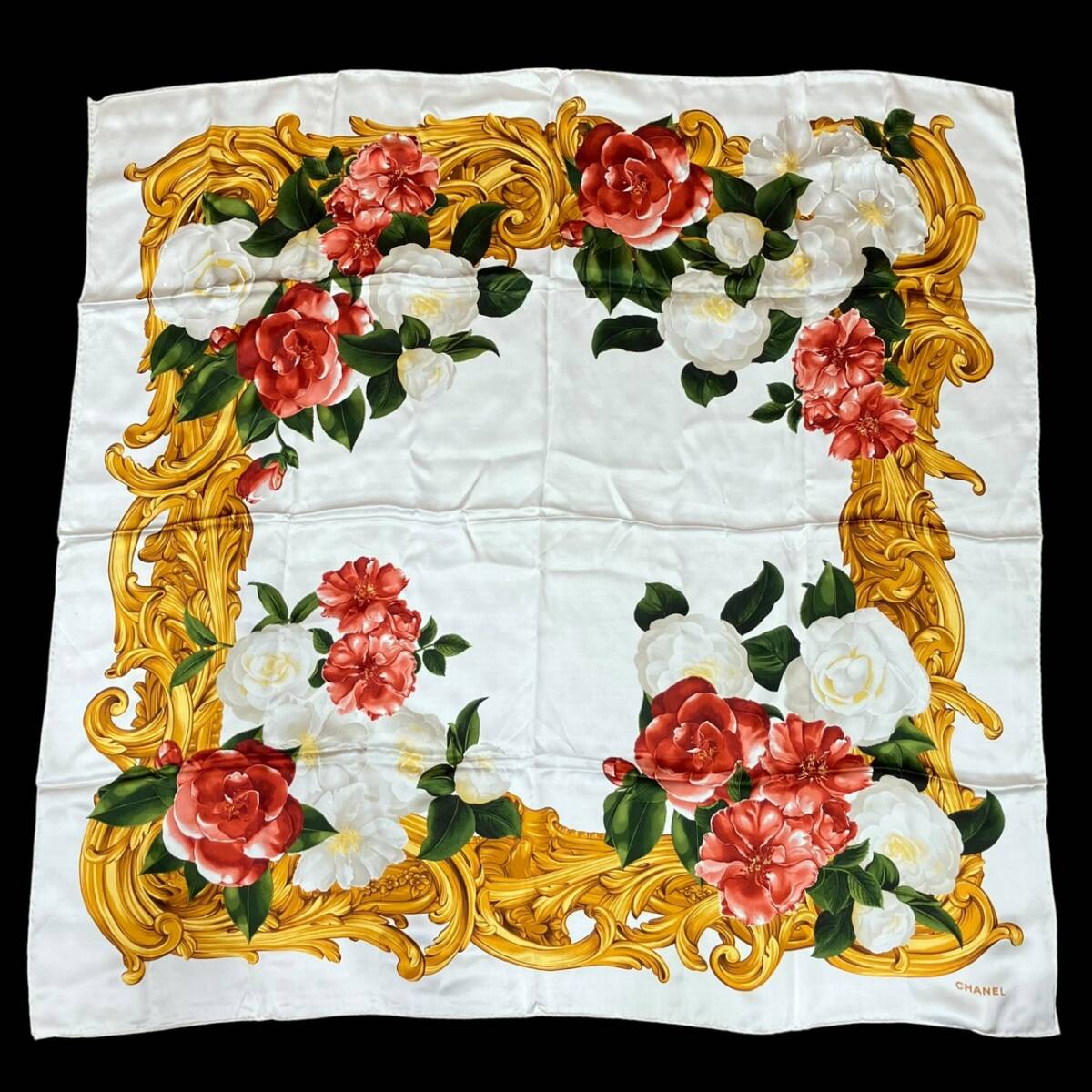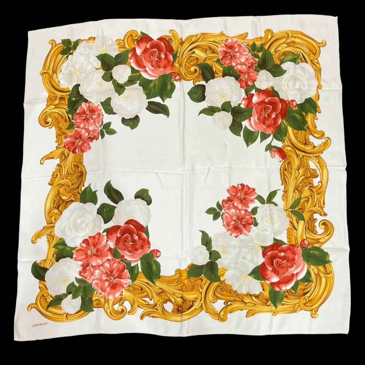 | CHANEL シャネル カメリア フラワー 大判 スカーフ シルク100% 花柄 ホワイト系 |