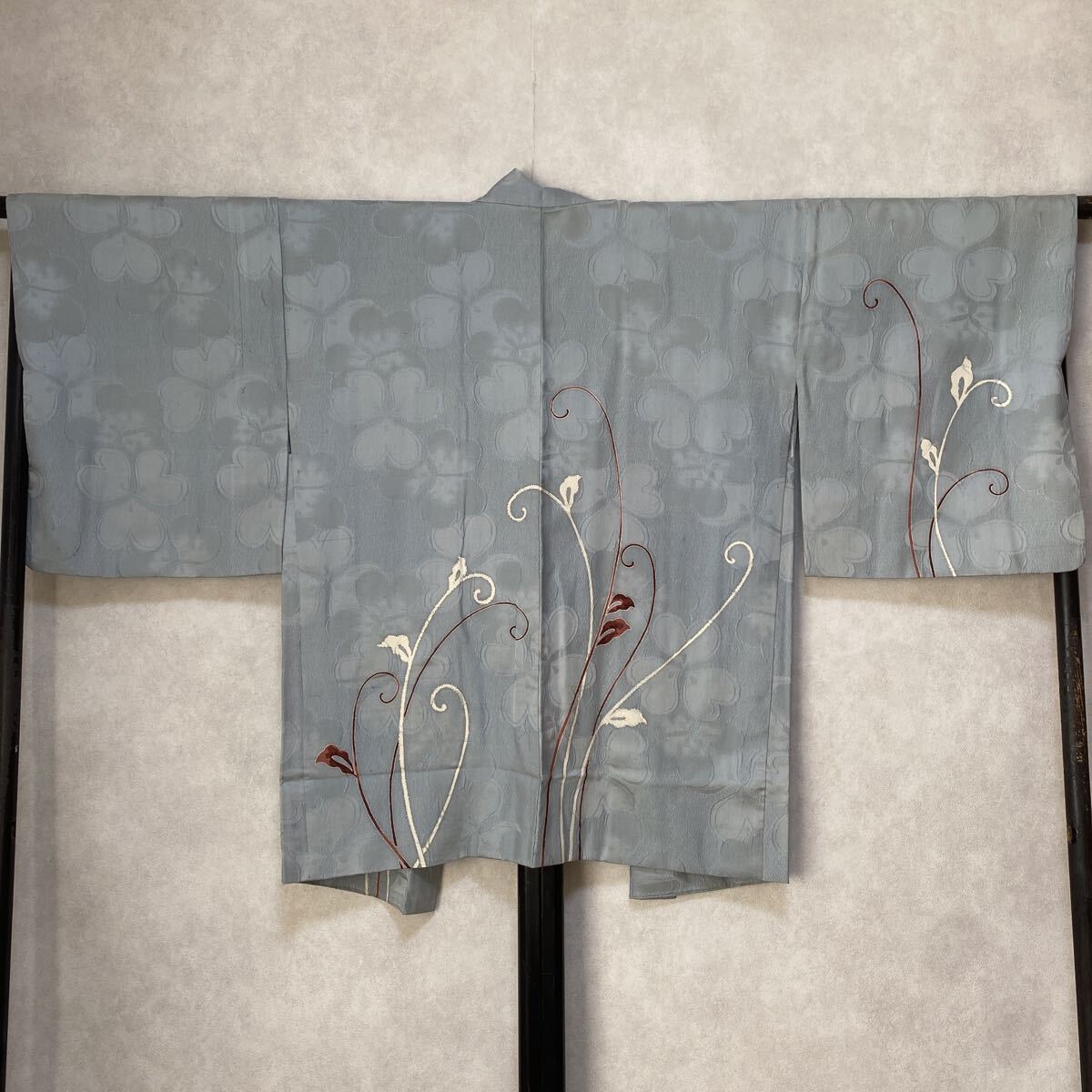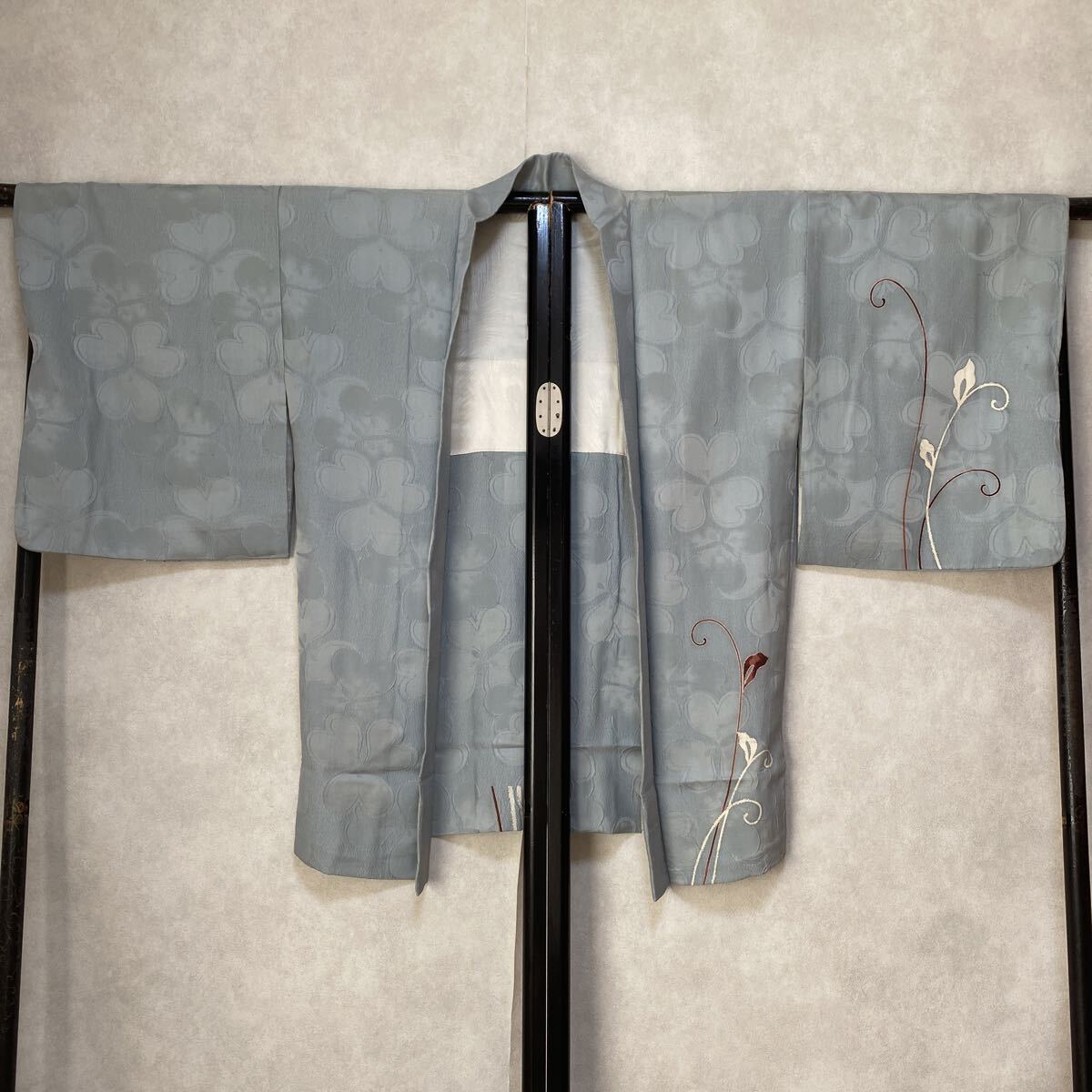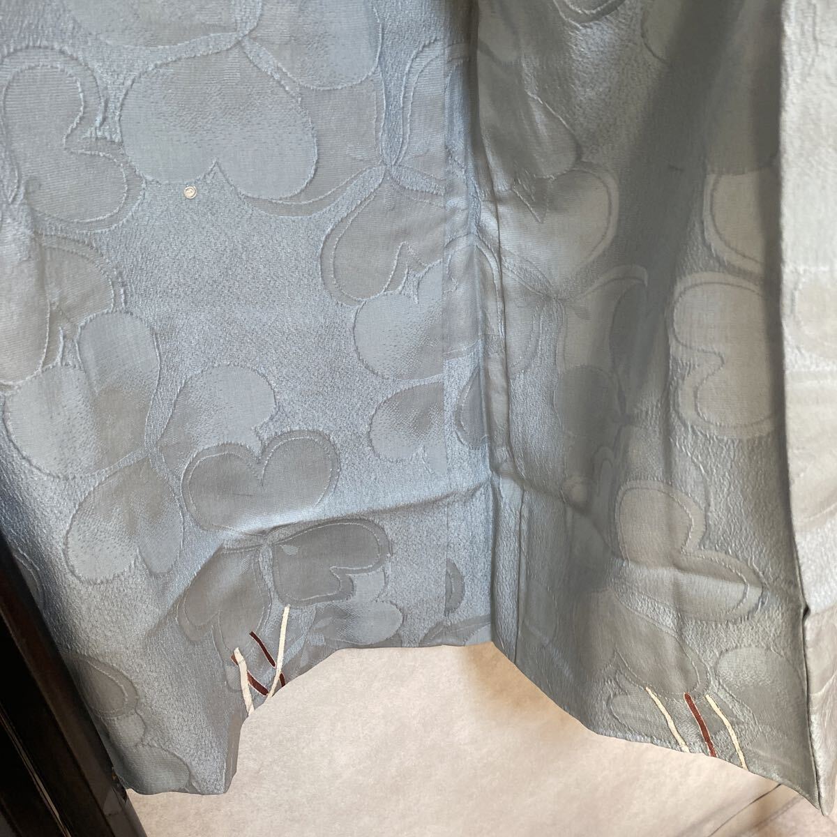 羽織 アンティーク 長羽織 道中着 道行 水色 クローバー 葉 金彩 着物 昭和レトロ 和洋折衷コーデ リメイク 25さ20-21s