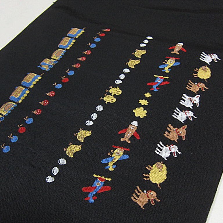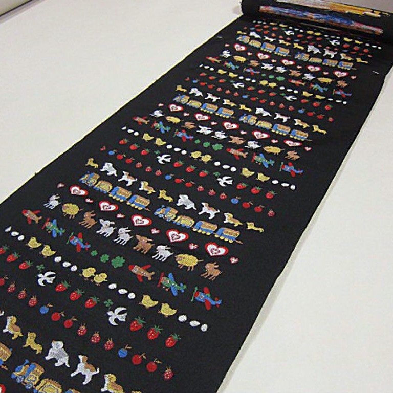 新品未仕立 西陣織九寸名古屋帯 黒地 列車 飛行機 ワンちゃん 苺 ひよこ