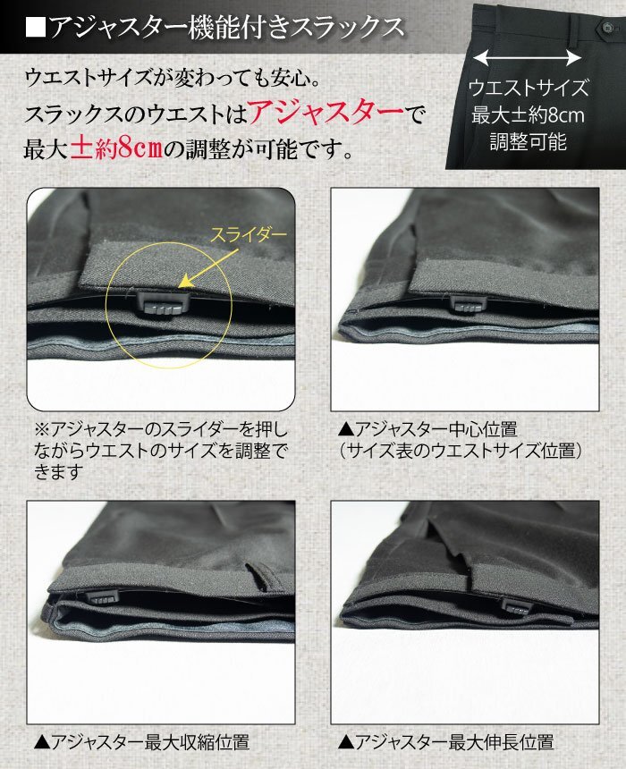 | スラックス | ノータック 股上浅め ボタン&ホック留め 平型持ち出し付き 烏天狗仕様 ウエストアジャスター付き(±約8cm) ヒザ当て付き |