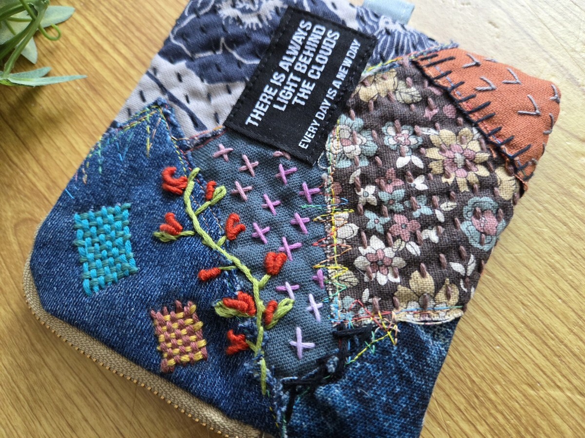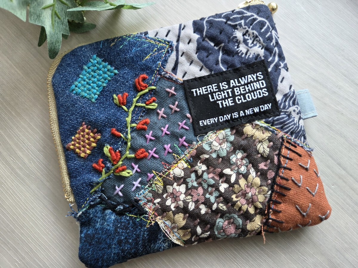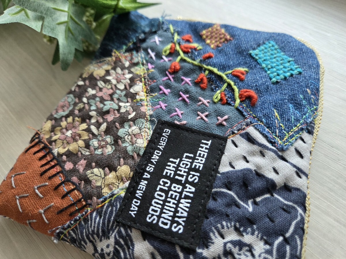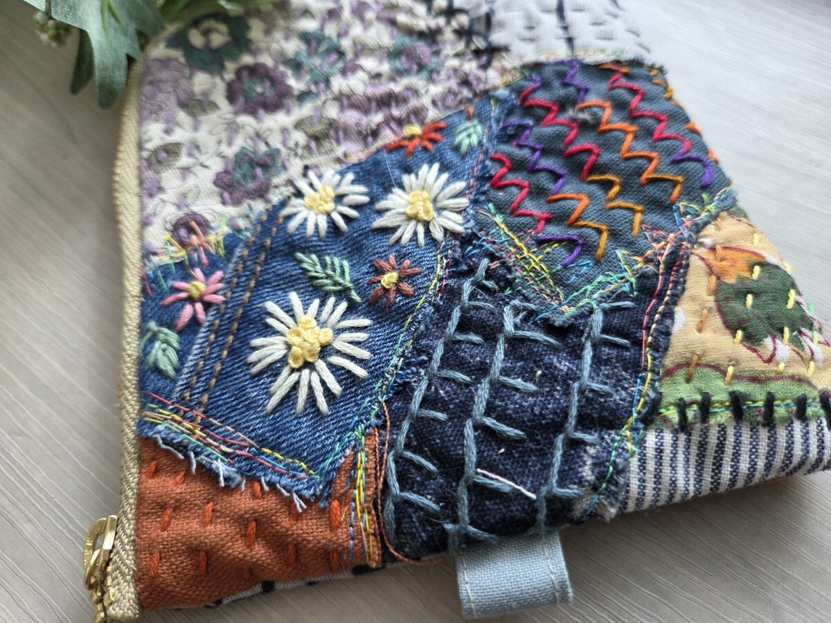 デニム生地や綿麻生地などをカラフルなミシン糸で自由に縫い繋げた後、花刺繍や刺し子を施しました。いろいろなステッチで飾り飽きのこないデザインです。気持ちがほっこりしてくださると嬉しいです。