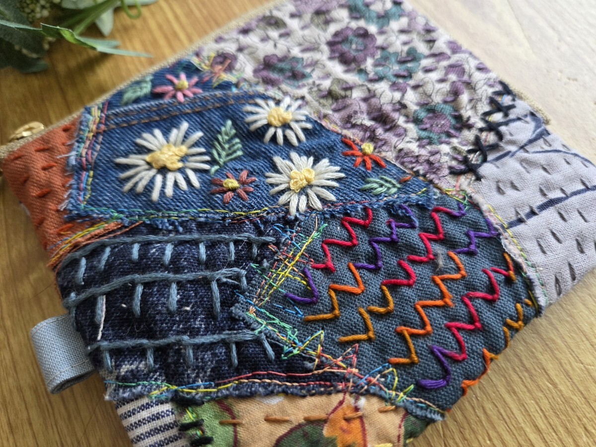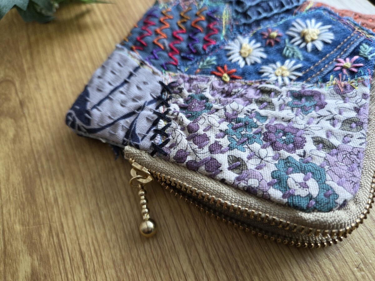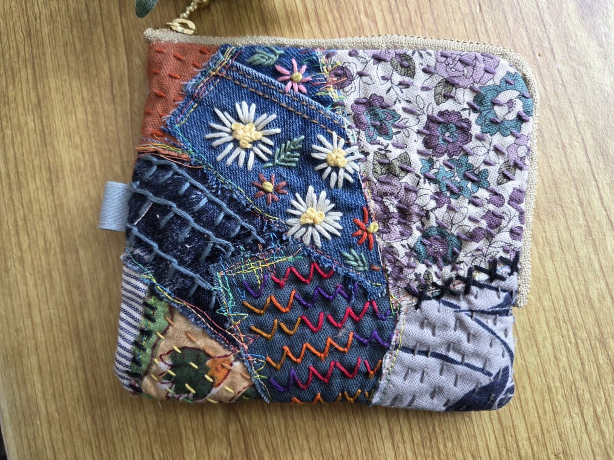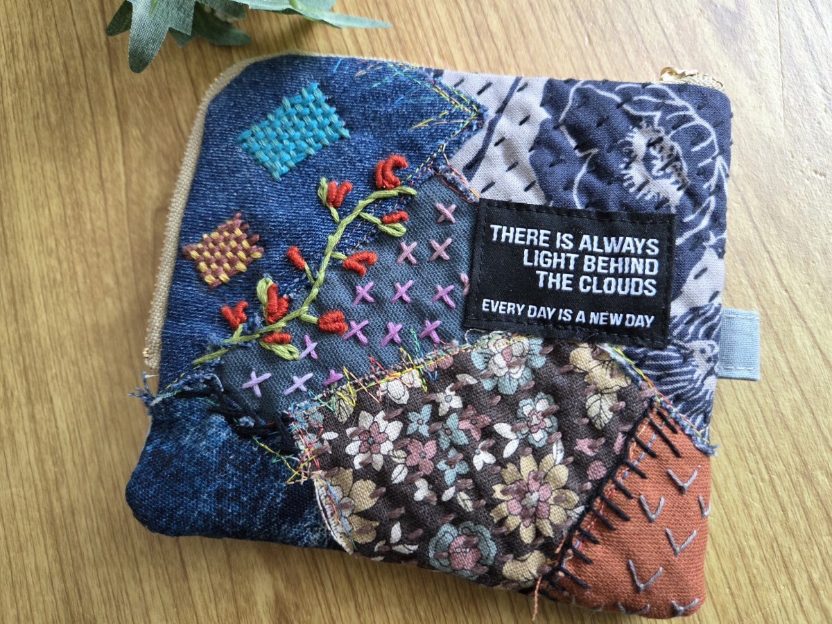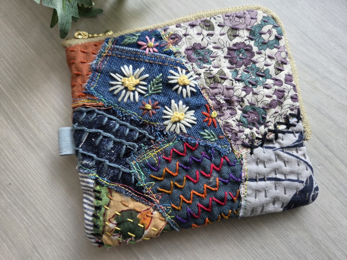 デニム生地や綿麻生地などをカラフルなミシン糸で自由に縫い繋げた後、花刺繍や刺し子を施しました。いろいろなステッチで飾り飽きのこないデザインです。気持ちがほっこりしてくださると嬉しいです。
