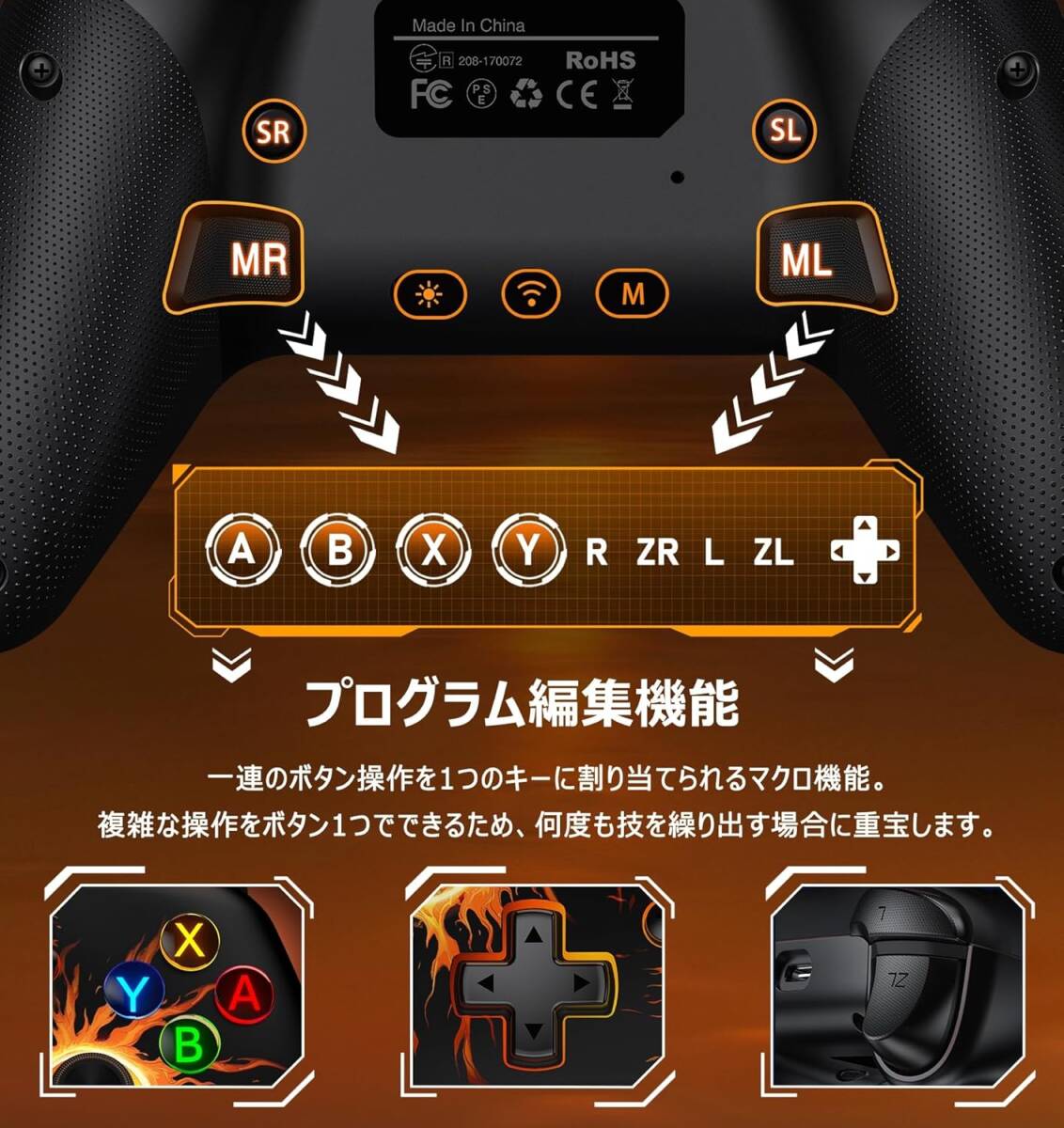 【マルチプラットフォームに対応したプログラム編集 &連射スピード3段階】M1/M2バックボタンはA/B/X/Y/L/ZL/R/ZR/L3/R3/Dパッドキーの基本ファンクションキーをマッピングすることができます。マッピングの2つのモード:①シングルプログラミングマッピング、②マルチプログラミングマッピング。オートTURBO/マニュアルTURBOモードをサポートします。TURBO+A/B/X/Y/L/R/ZL/ZRを設定できます。3つの調整可能な速度があります: 5ショット/秒、12ショット/秒、20ショット/秒。