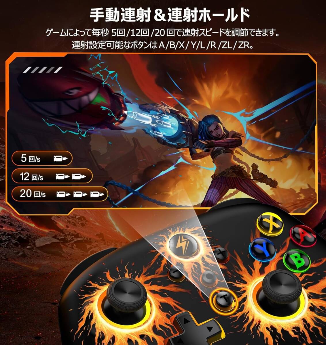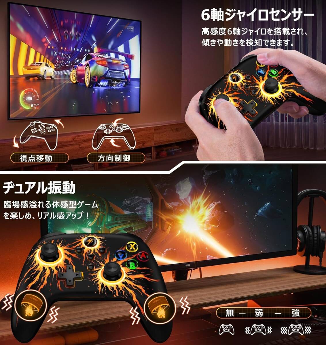 【ジャイロセンサー & スリープ解除】内蔵の6軸ジャイロセンサーが振動による動きを感知し、安定性と方向性を提供します。ワンキーウェイクアップに対応】初回接続時は「Y + HOME」ボタンを押します。5分間ボタン操作がなかった場合、コントローラーは自動的にスリープ状態に入り、ホスト画面も自動的にオフになります。ホームボタンを1秒以上押すだけでコントローラーが起動します。★ご注意:ジャイロセンサー 機能はSwitchシリーズでのみ使用可能