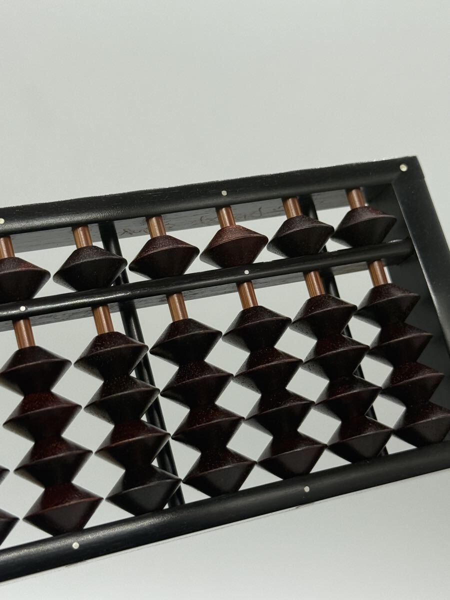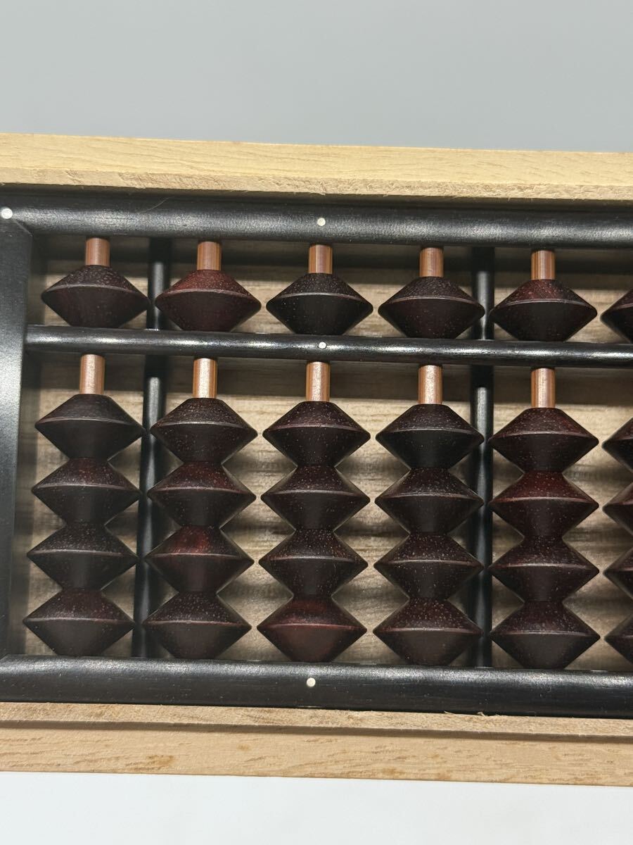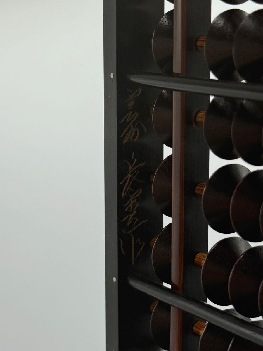 濃い赤褐色の深みある紅木(ローズウッド)が使用されており、玉の形状・均一性・手触り、枠の作りからも職人技が感じられる逸品です。重厚で安定感があり、実用にも鑑賞にも適したそろばんです。