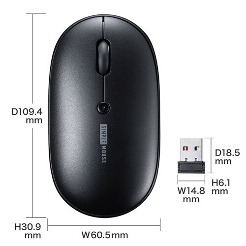 ※配送の送り主はサンワサプライ(株)と記載されています。沖縄・離島配送不可となります。 当店は正規販売代理店です。 特長 対称形で使いやすい静音の2.4GHzワイヤレスマウスです。 まるいフォルムで使いやすいシンプルデザインです。 クリック音が非常に静かで、周りに迷惑をかけずにパソコンの操作ができます。 左右のクリックボタンにPanasonic社製の高品質スイッチを採用しています。 用途に合わせてカーソル速度が変更できる、カーソル速度切り替え機能付きです。800・1200・1600の3段階の切り替えができます。 ノートパソコンに差したままで、持ち運びや保管ができる小型レシーバーです。 ケーブルを気にせず使えるワイヤレスタイプです。 電波障害に強い2.4GHzデジタル帯で、通信範囲が半径10mの広範囲で安定したデータ通信が可能です。 ※電波干渉のない場合に限る。 ※透明ガラスなどの一部の表面では動作しにくい場合があります。 レシーバーはマウス本体の中に収納できるので、紛失の心配を軽減します。 メーカー保証期間180日 ※当店発注日からになります。 気をつけておりますが、タイミングによっては在庫切れの場合があります。 不使用時の電池消耗を防止する電源ON・OFFスイッチ付きです。 仕様
