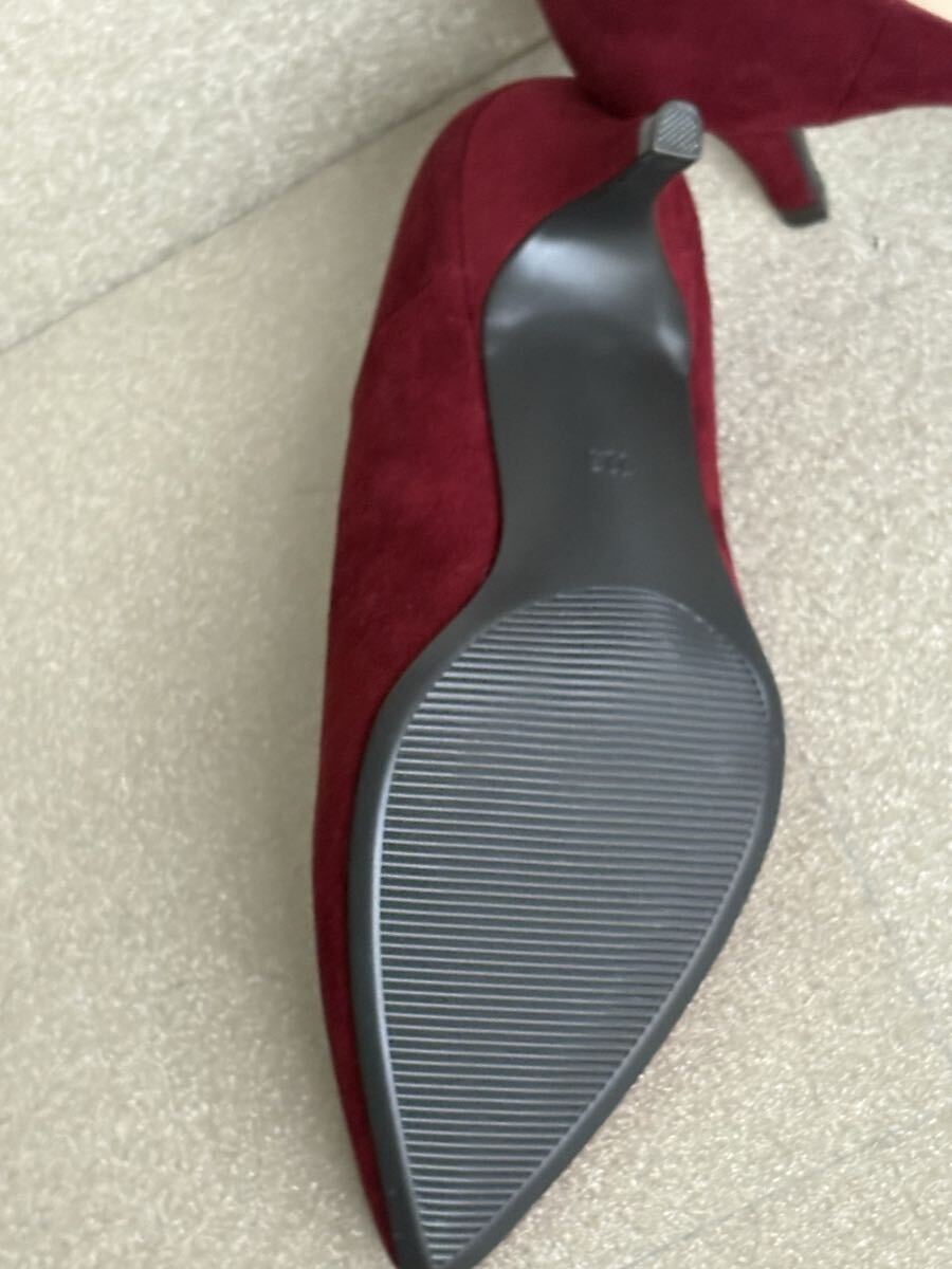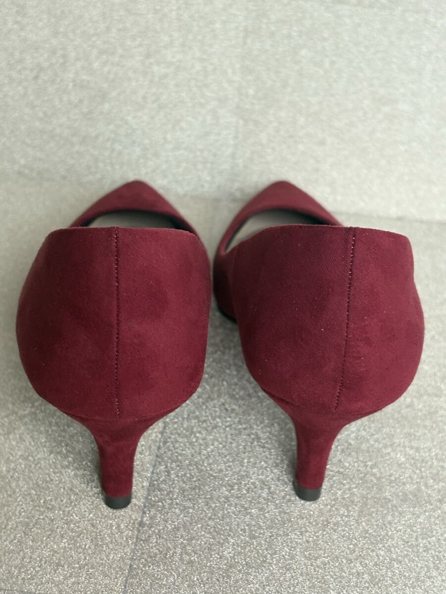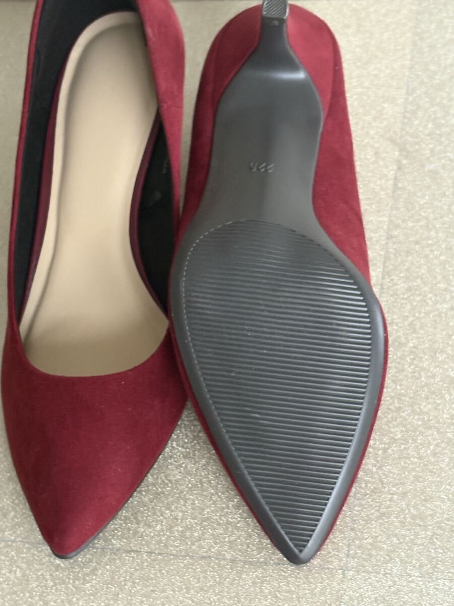 カラーはレッド系。サイズは22.5cmで、ヒールの高さは5.5〜6cm程度です。