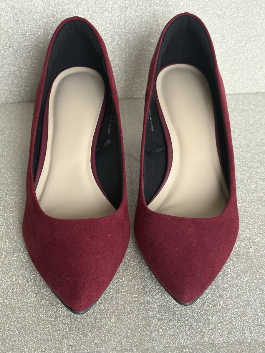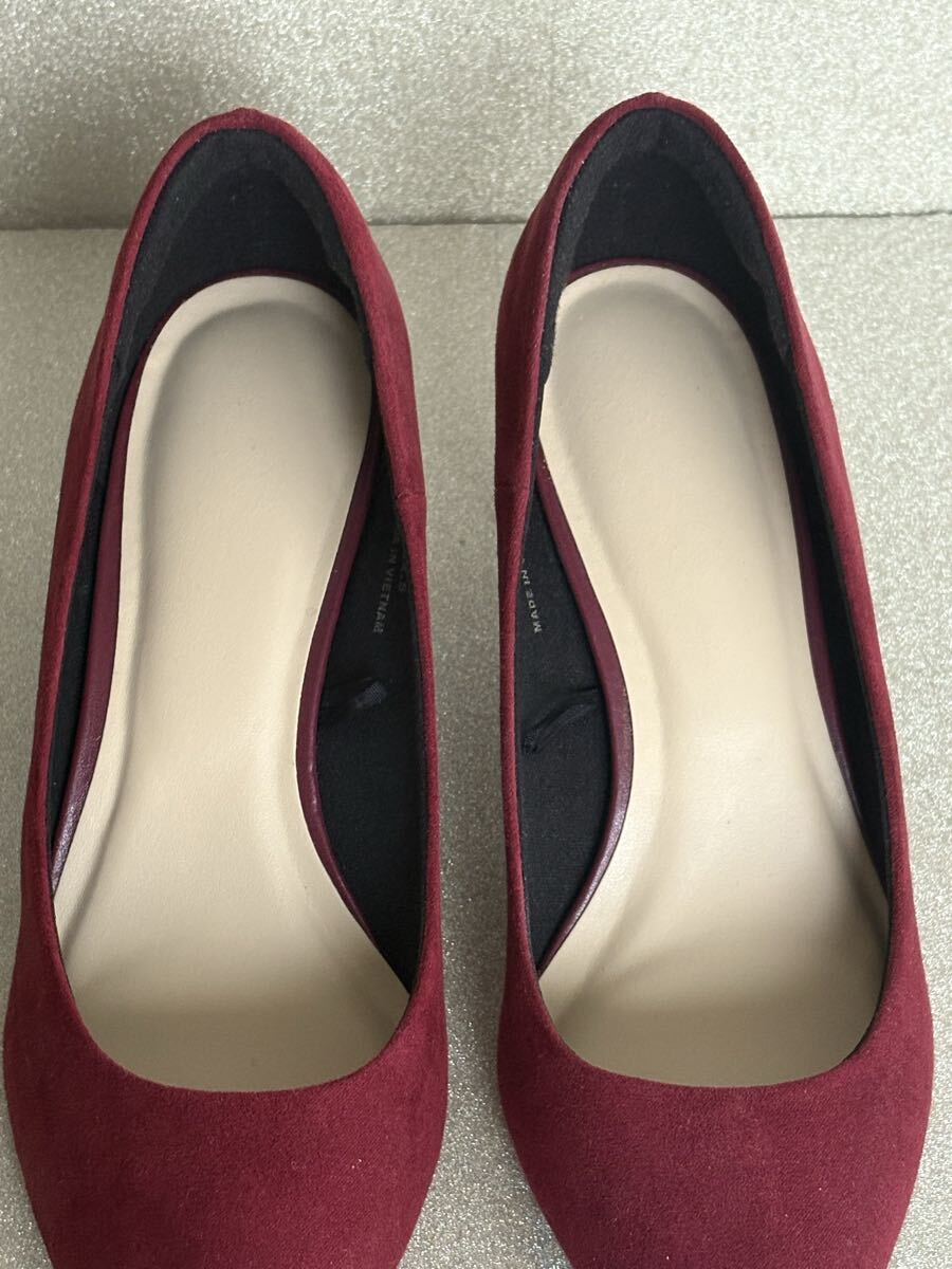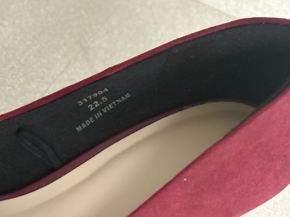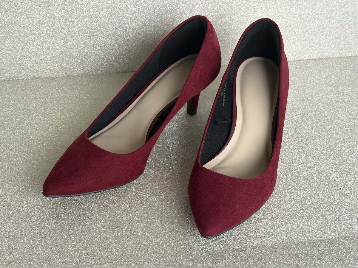 カラーはレッド系。サイズは22.5cmで、ヒールの高さは5.5〜6cm程度です。