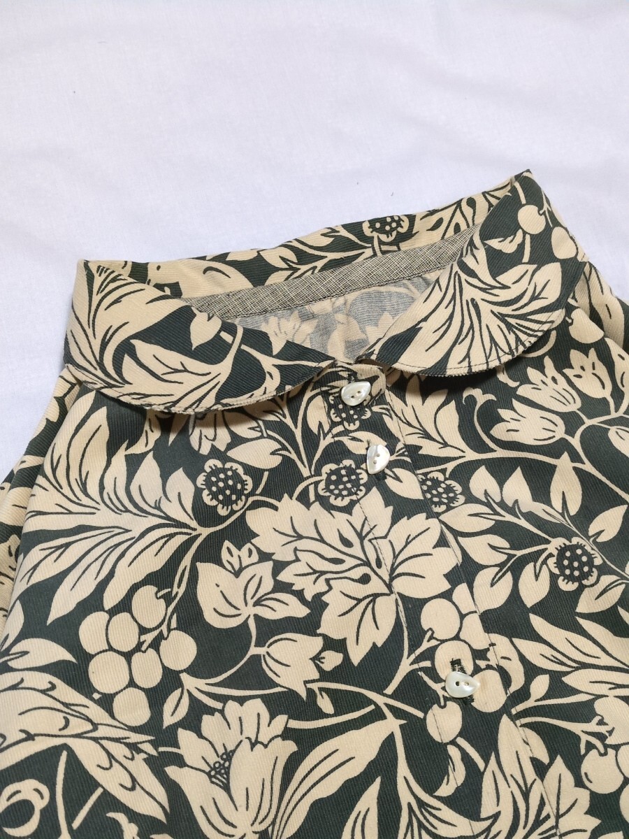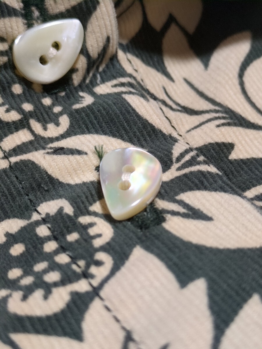 前ボタンで、生地に合わせて花弁のような小さなシェルボタンを付けました。