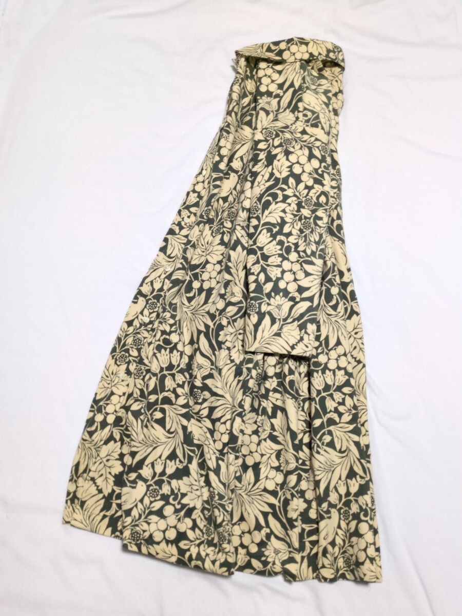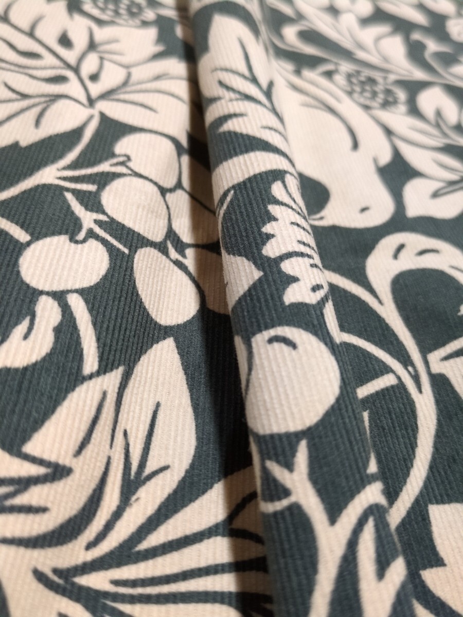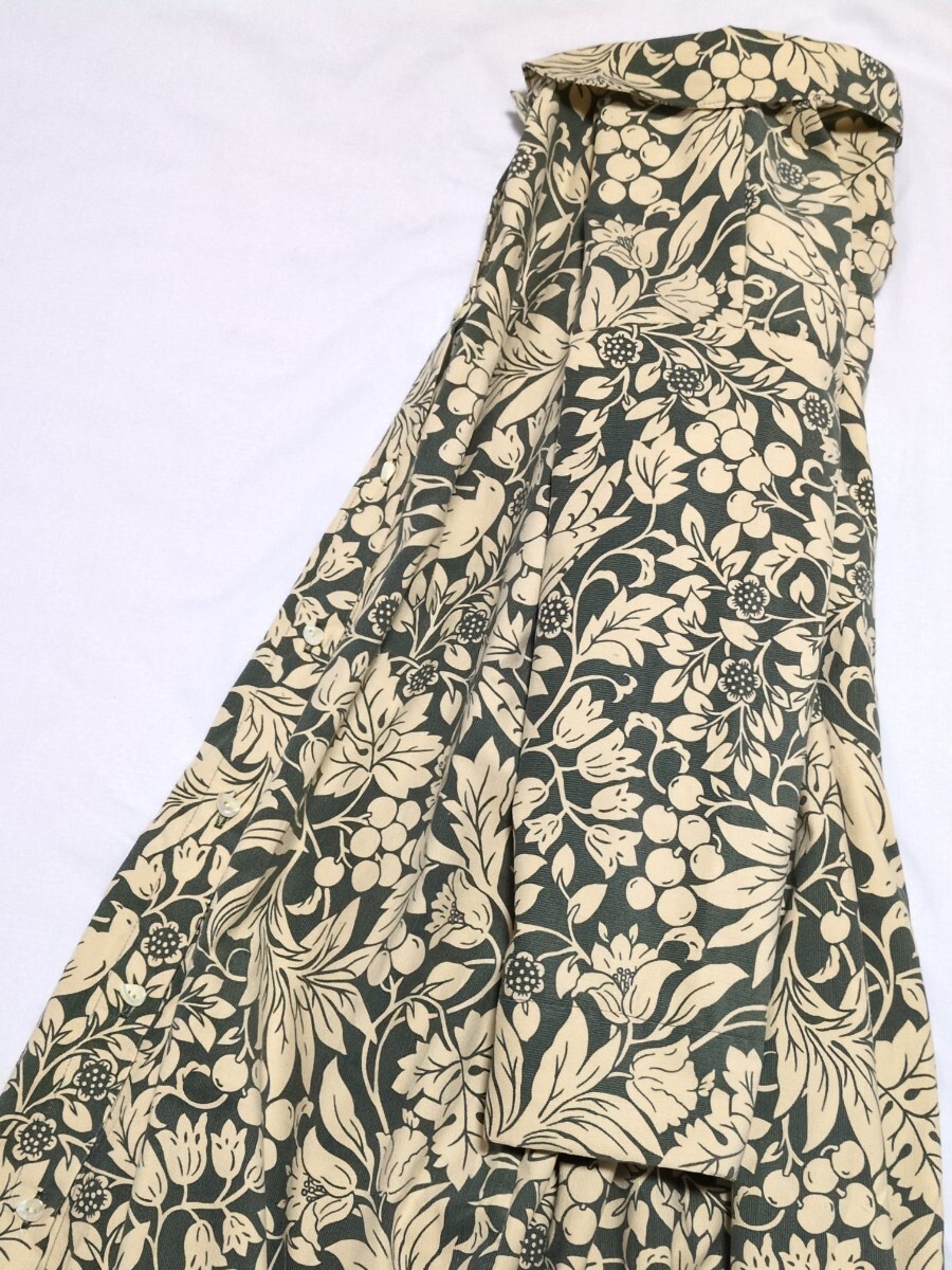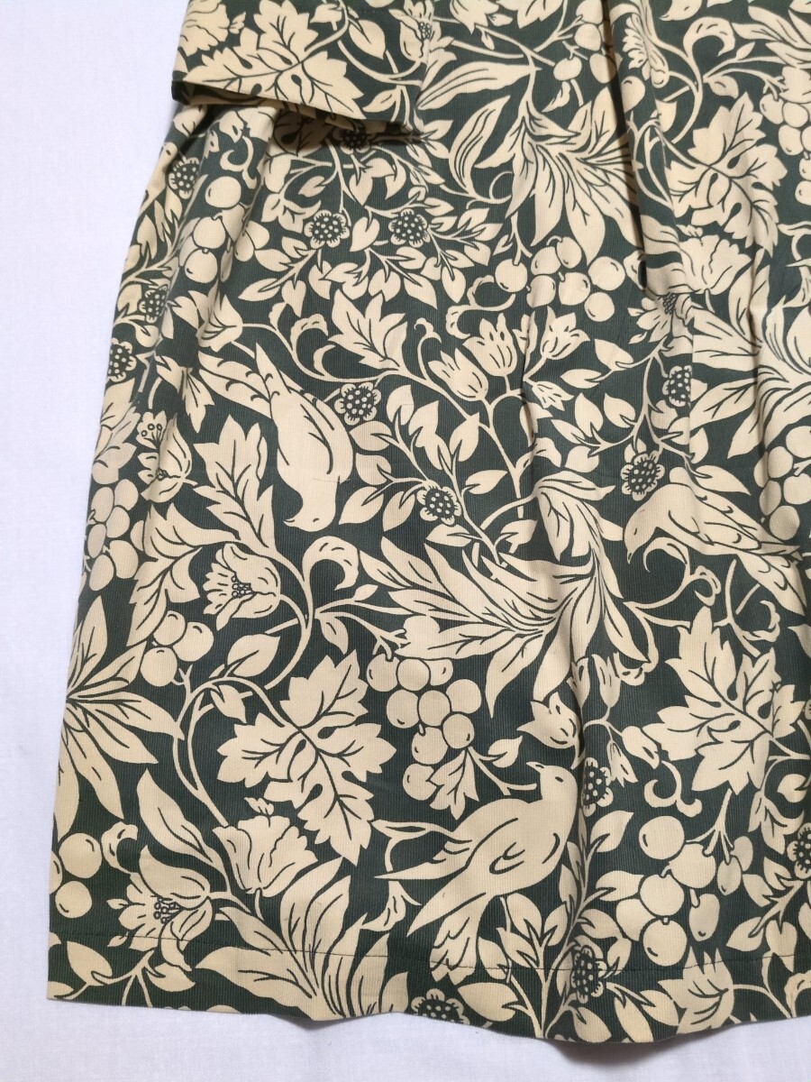 深みのあるグリーン地にflowerと鳥が大胆に描かれた生地です。