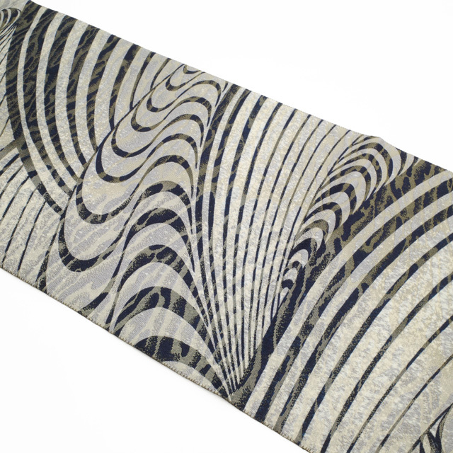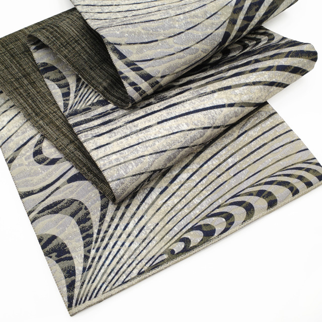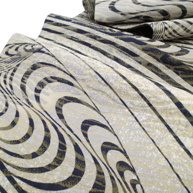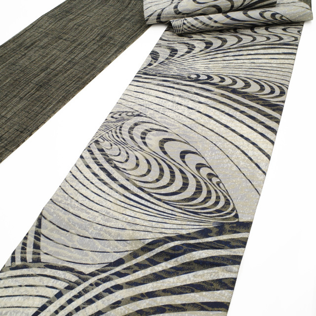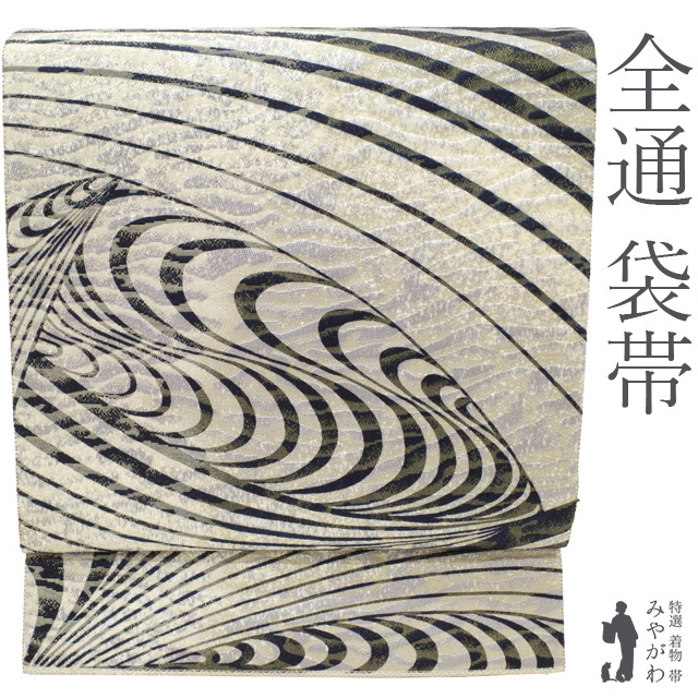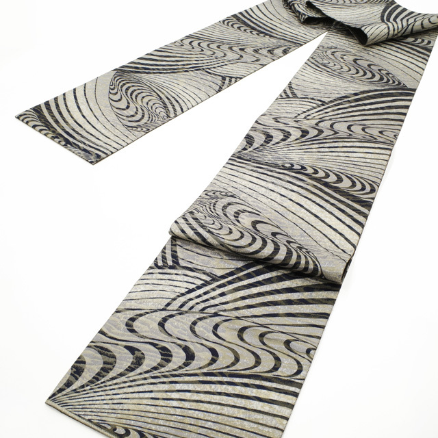 【新古品】 袋帯 未使用 正絹 全通 淡ライトグレー地 黒紺 流水 水面 地紋 金糸 モダン おしゃれなデザイン クール 上質 カジュアル 美品 春 秋 冬 仕立て上がり みやがわ sb54782