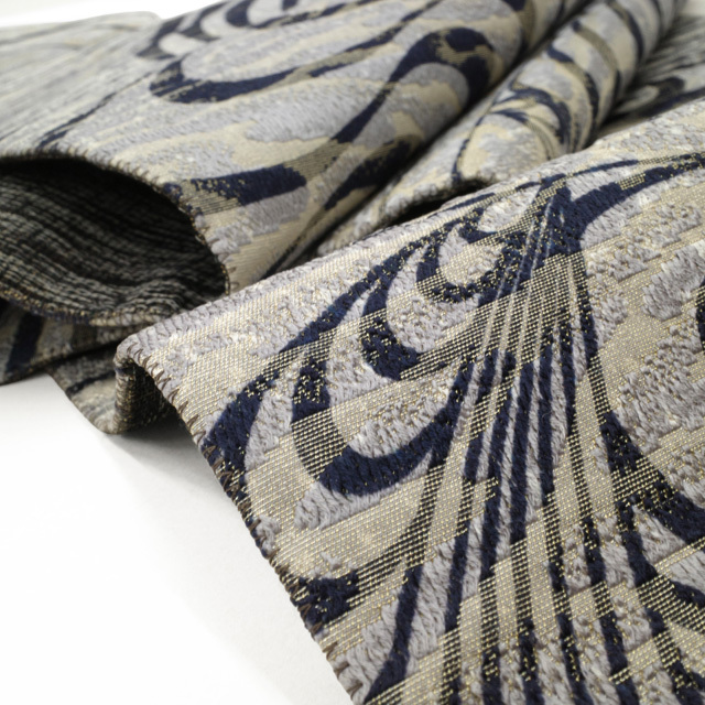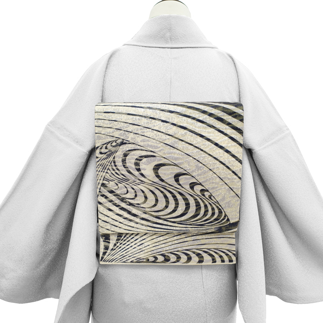 こちらは、ライトグレーの地に水面のような美しい地紋が浮かび、そこへ金糸がほどよく織り込まれた上品な袋帯。