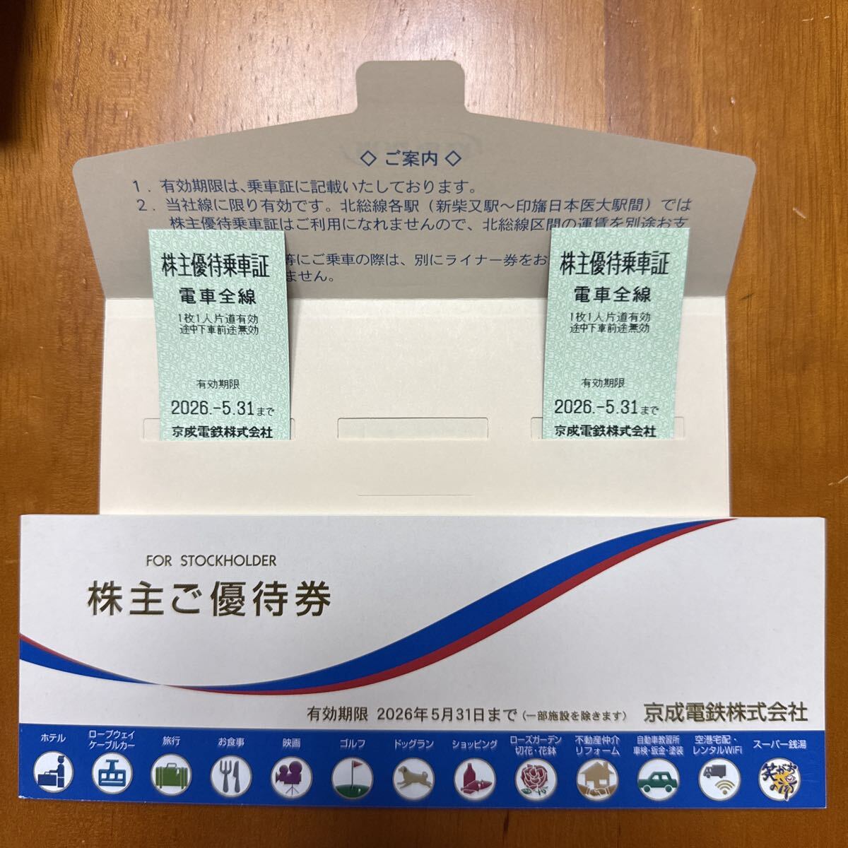 京成電鉄全線に乗車可能な乗車券2枚です(最新)。普通郵便送料込みです。スカイライナーには別途特急券が必要です。(スカイアクセス経由も利用できますが、北総線内各駅での乗下車はできません)京成ストアや筑波山・鋸山ロープウェーなどグループ各社で利用できる割引優待ブックを添付します。優待内容の詳細については https://www.keisei.co.jp/keisei/ir/stock/benefits.htmlでご確認ください。