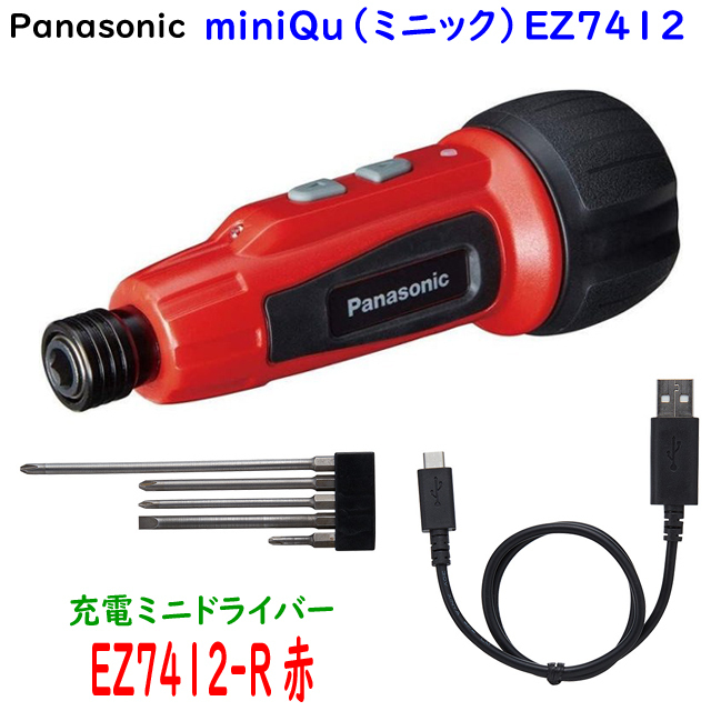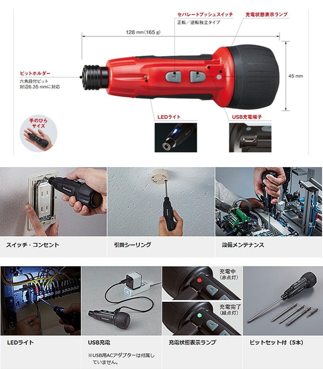 ■Panasonic パナソニック 充電ミニドライバー EZ7412S-R (赤) miniQu(ミニック) ★新品・未使用 ★コンパクトで小ネジ締めにぴったり! ★充電ケーブル・ビットセット付き ●電動でネジ送りを素早く、手動で手回し工具感覚で きっちり手締め ●過充電保護・過放電保護・過電流保護の3つの保護機能で モーターと電池をしっかり保護して安心 ●樹脂部材(引掛けシーリング、スイッチプレート等)を 破損しない適正トルク1.0N・m、適正回転数230回転/分 ●LEDライト搭載で暗いところでも作業しやすい 【仕様】 ・能力(小ネジ・鉄/バネ座金なし):約620本(M3×5)、約540本(M6×10) ・電池(内臓式):リチウムイオン電池3.7V 850mAh ・充電時間:約45分(EZ37C4・C5の場合)、約35分(市販USB充電器5V1Aの場合)、約25分(市販USB充電器5V2Aの場合) ・ネジ締め作業範囲:小ネジM3(電動時)、小ネジM6(手締め時) ・チャック:ワンタッチビットロック方式(段付きまでの寸法が9mm/11.5mm/13mm) ・適合ビット:六角ビット対辺6.35mm ・締付トルク(Nm):1(電動時/剛性体最大締付トルク)、8.0(手締め時/最大耐久トルク) ・回転数(回転/分):230 USB端子:1端子、microUSB Bタイプ、DC5V ・本体寸法(mm):全長128×全高45×全幅42 ・質量(g):165 ★この機会に是非!お買い上げください! |