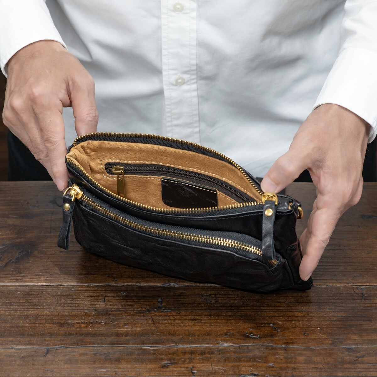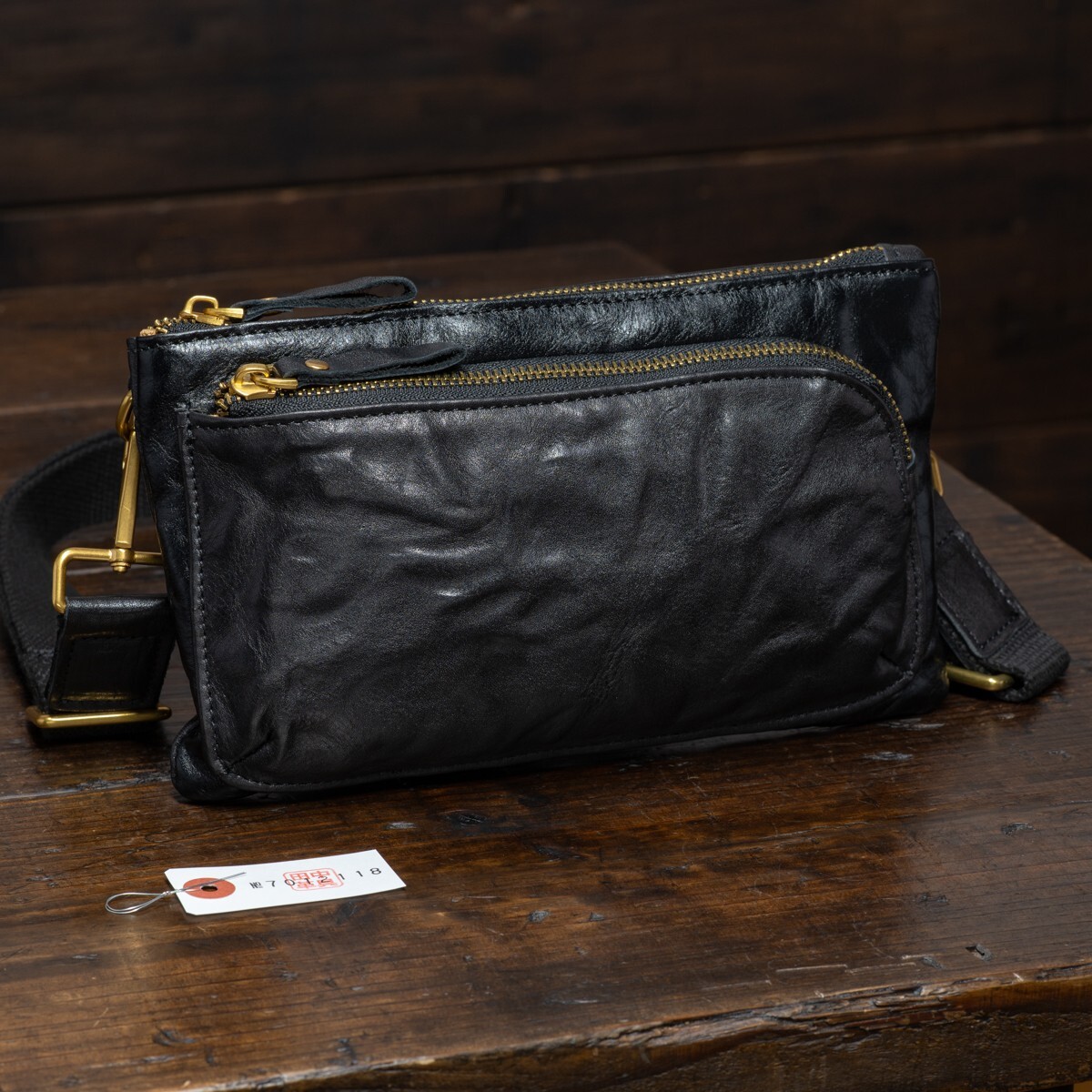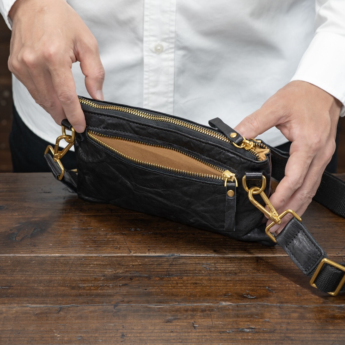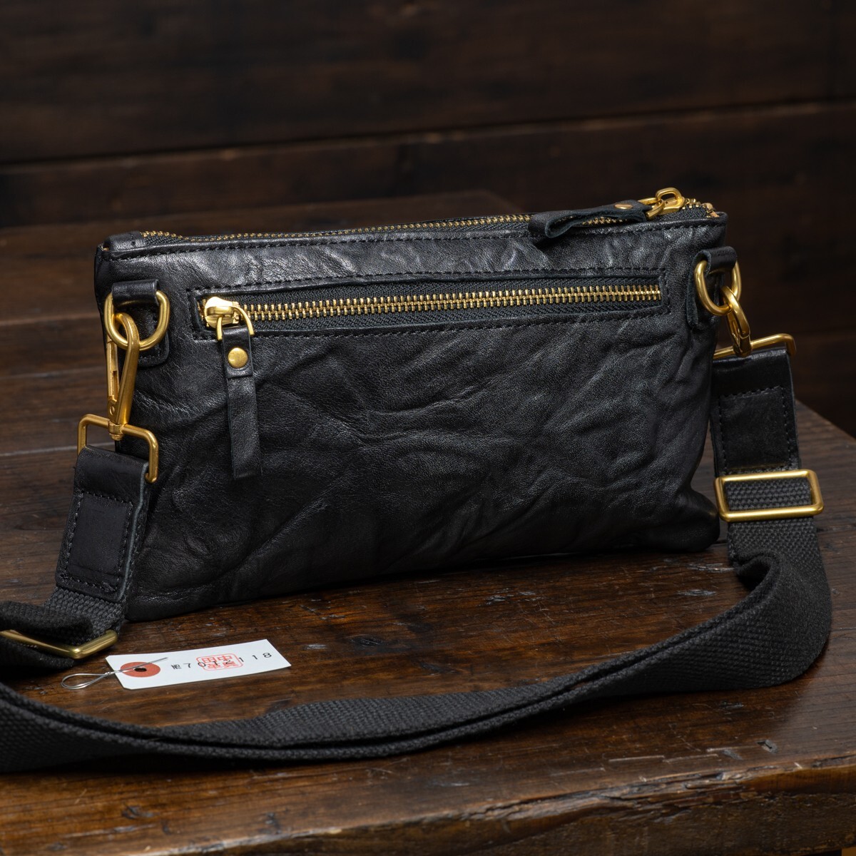 ウォッシュレザーを使ったアンティークな雰囲気のミニショルダーバッグです。艶のあるブラックの落ち着いた色合いが、大人の装いにも自然に馴染みます。