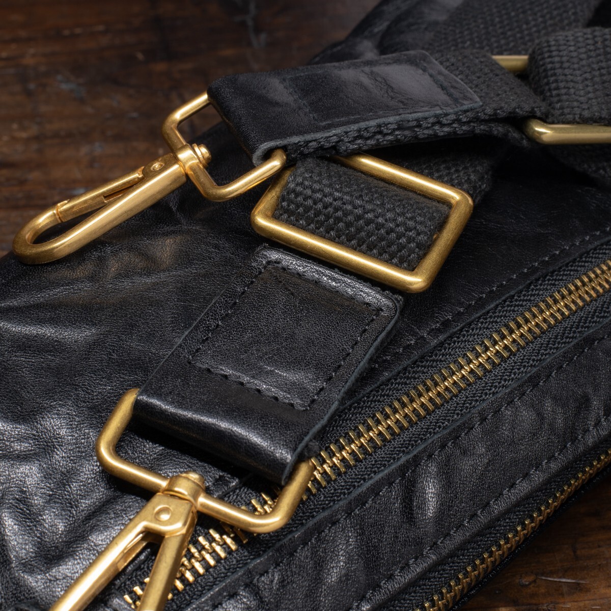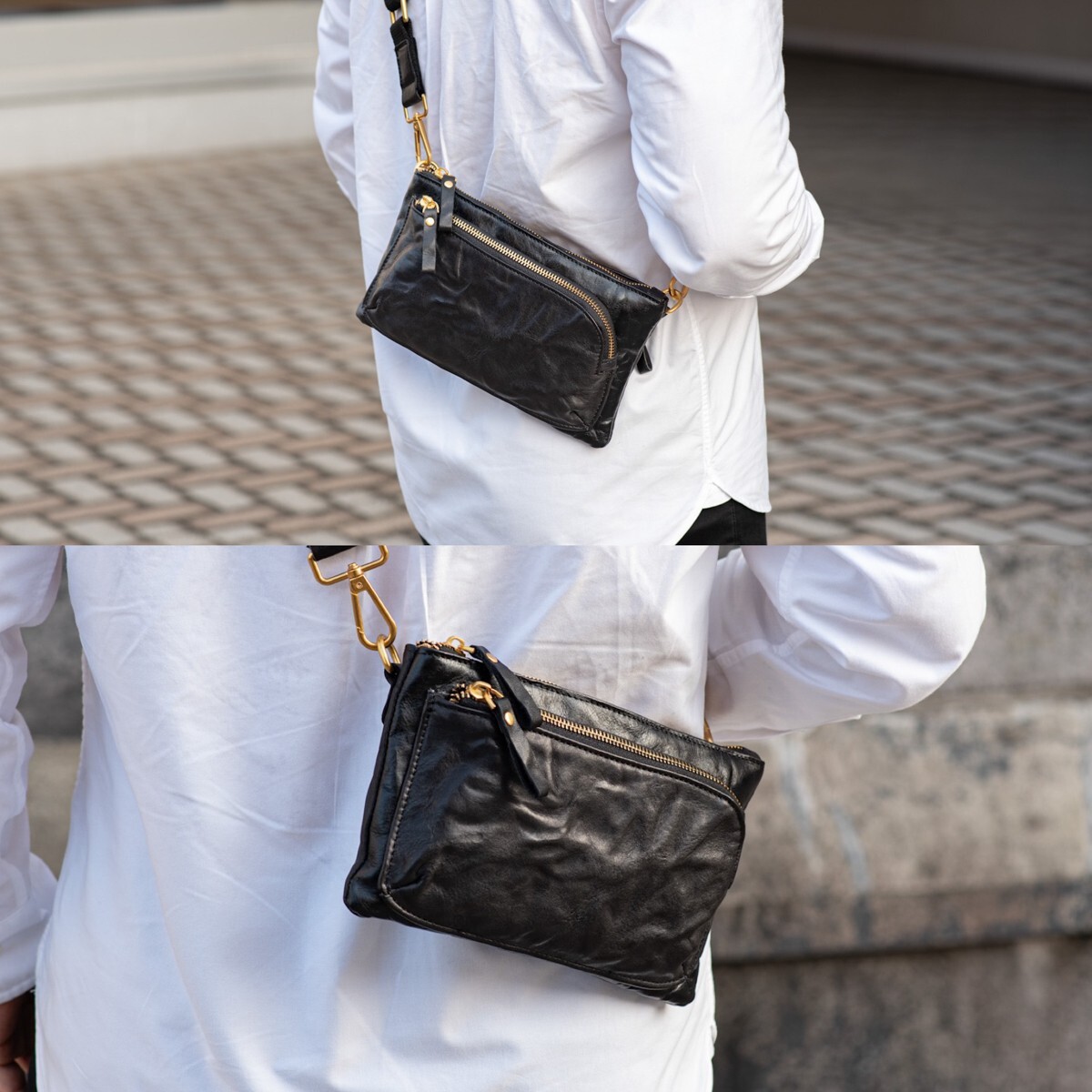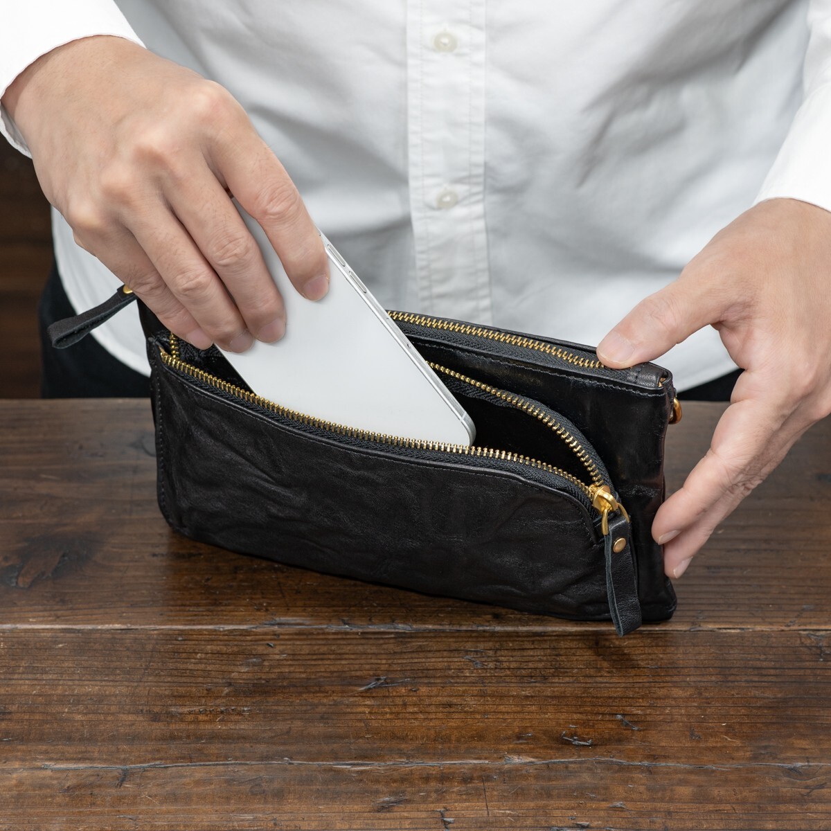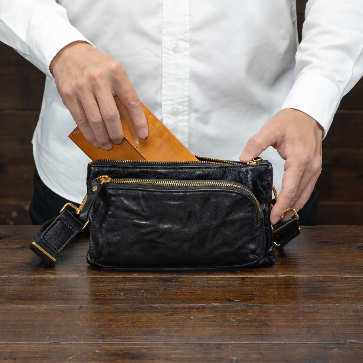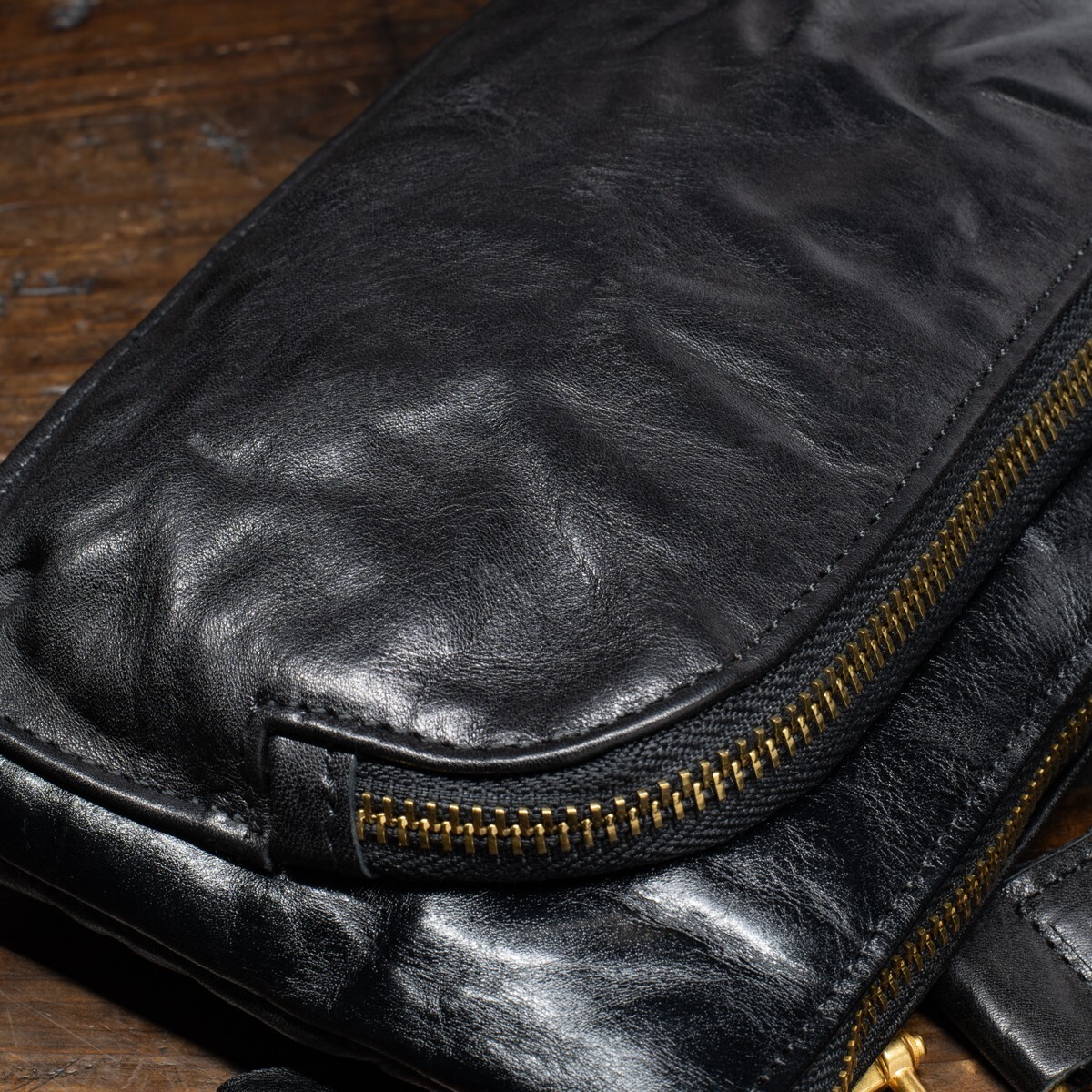 ウォッシュレザーを使ったアンティークな雰囲気のミニショルダーバッグです。艶のあるブラックの落ち着いた色合いが、大人の装いにも自然に馴染みます。