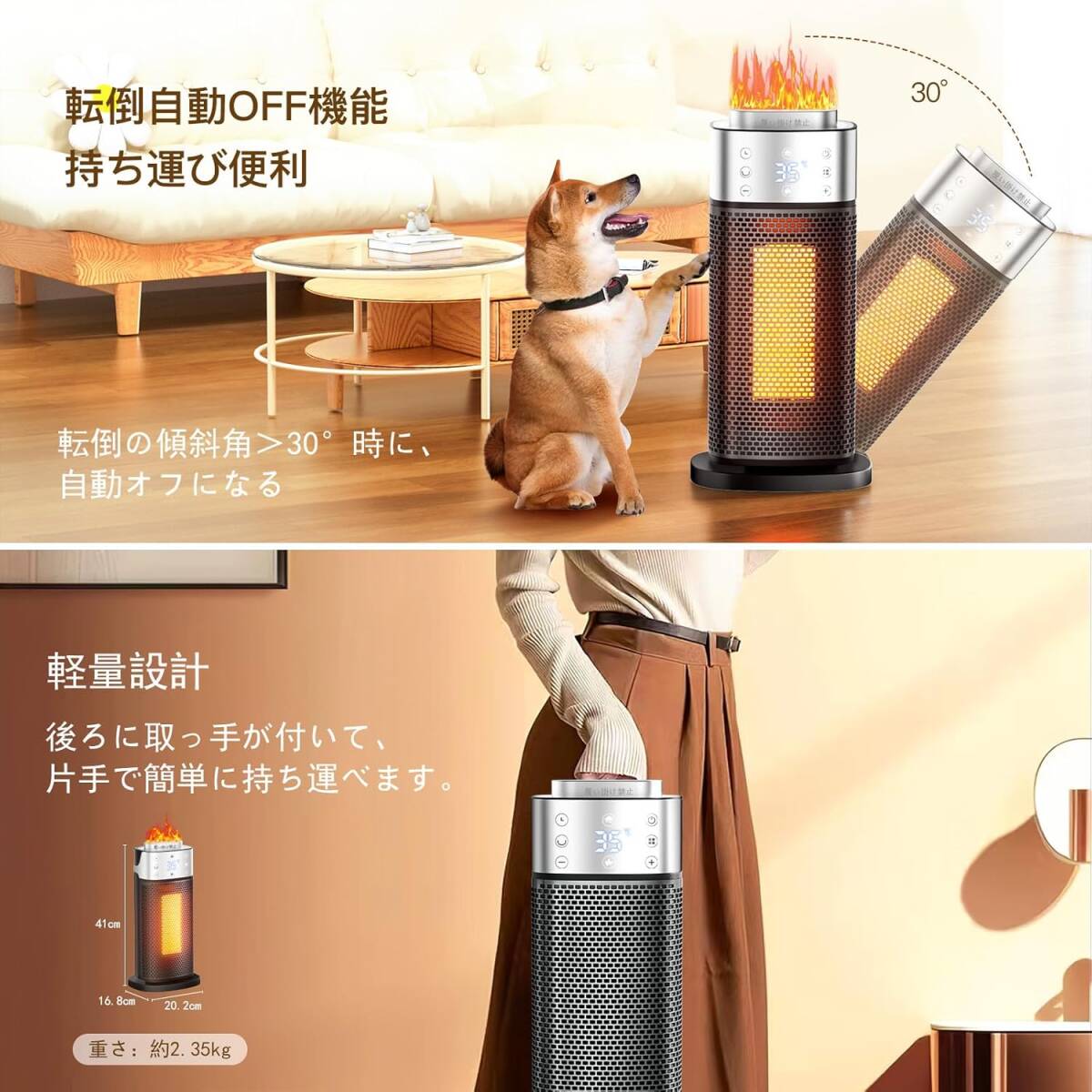 • 「多重安全保護:転倒自動オフ&冷却機能&過熱保護&PSE認証済み」製品ヒーターは多方面から安全保護があり、お年寄りにも安心してお使いいただけます。転倒自動オフ:転倒の傾斜角>30°時に、自動オフになります。お子様がいるご家庭でも、安心してご使用いただけます。冷却機能:放熱のため、電源を切ったあと30秒の自然風モードをします。誤ってヒーターパネルに触れても火傷する心配はありません。過熱保護:不正使用や使用環境の変化によりヒーター内部が過熱した場合、過熱保護サーモスタットが作動し電源を遮断します。また、本体素材には高温でも燃えにくい難燃性素材を使用し、安全性をさらに高めました。