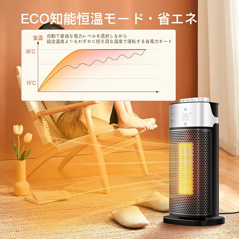 • 「ECO知能恒温モード・節電対策」ECO知能恒温モードが備えるファンヒーターは、温度の加減を設定することでECOモードがオフになり、LCD 画面に表示されます。周囲温度の変化に応じて、設定温度範囲内で温風を自動調整します。お好みの温度に合わせて、15℃~35℃まで無階段での設定が可能です。ECOモードはマニュアル運転時に比べ約20%の節電があります。暖房器具を使用しながら、無駄な電気代を抑えて、環境にも財布にも優しい機能です。