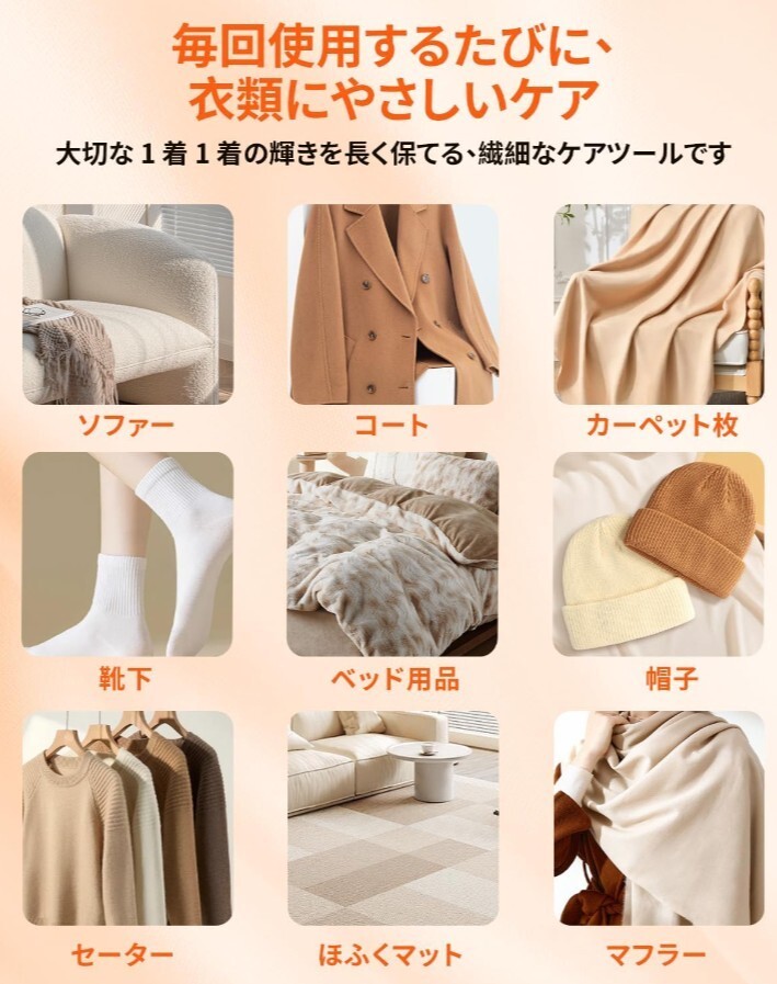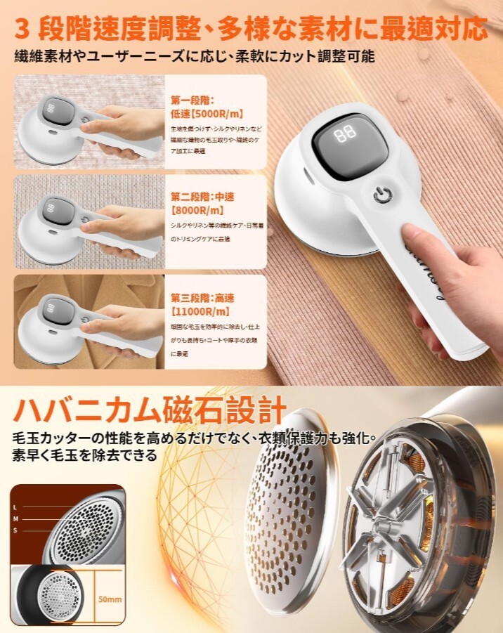 【3段階調節&全生地対応】生地・毛足に合わせ、低・中・高3段階速度切替。低速はシルク / リネン等繊細生地を守り、中速は日常着メンテナンスに、高速は厚手コート / ソファカバー等頑固毛玉に対応。衣類以外にも寝具・カーペットまで幅広く使える万能ツール。