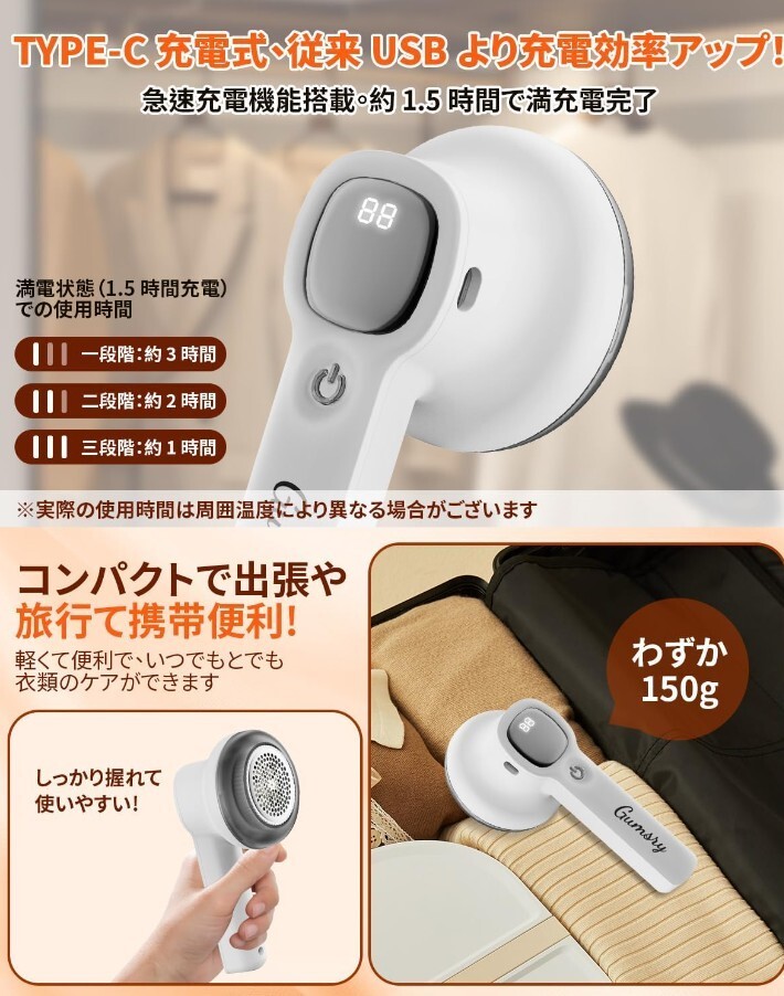 【LCD残量表示&TYPE-C充電】本体LCDディスプレイで、残量・モード・充電状態をリアルタイム確認。TYPE-C充電なので、スマホ充電器 / モバイルバッテリーで簡単補充。約1.5時間満充電後、低速モードで最大3時間連続使用可。充電中も使用可能で急ぎに対応。