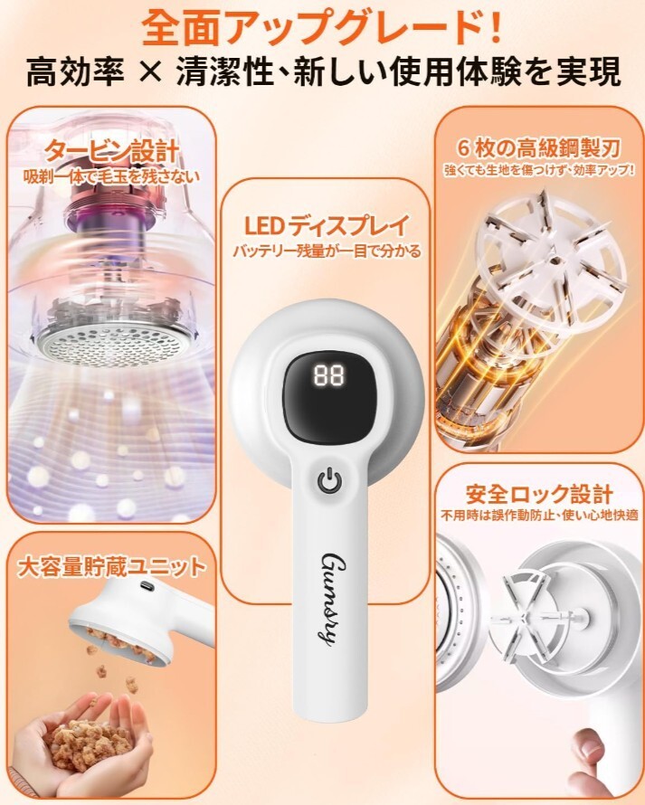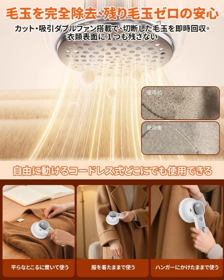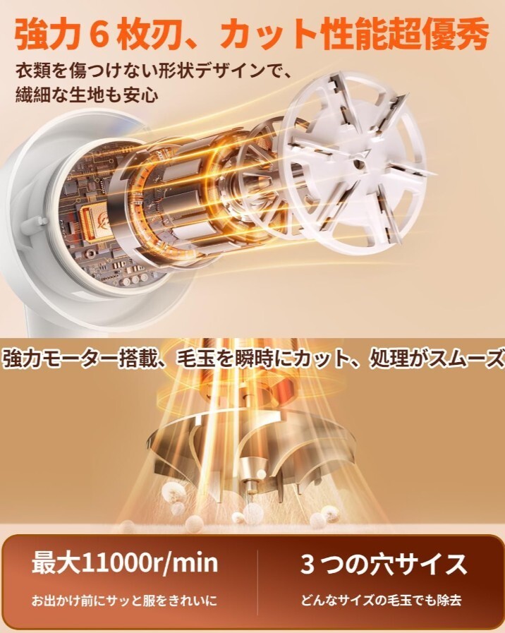 【11000rpm&高速 6 枚刃】高硬度ステンレス6枚刃を搭載し、上下浮動で衣類に密着。8000rpm高速モーターで、単体毛玉や塊状繊維くずを瞬時切断・除去。処理後は毛羽立ちなく、新品のような滑らかさを回復し、日常ケアやシーズン替えに最適。