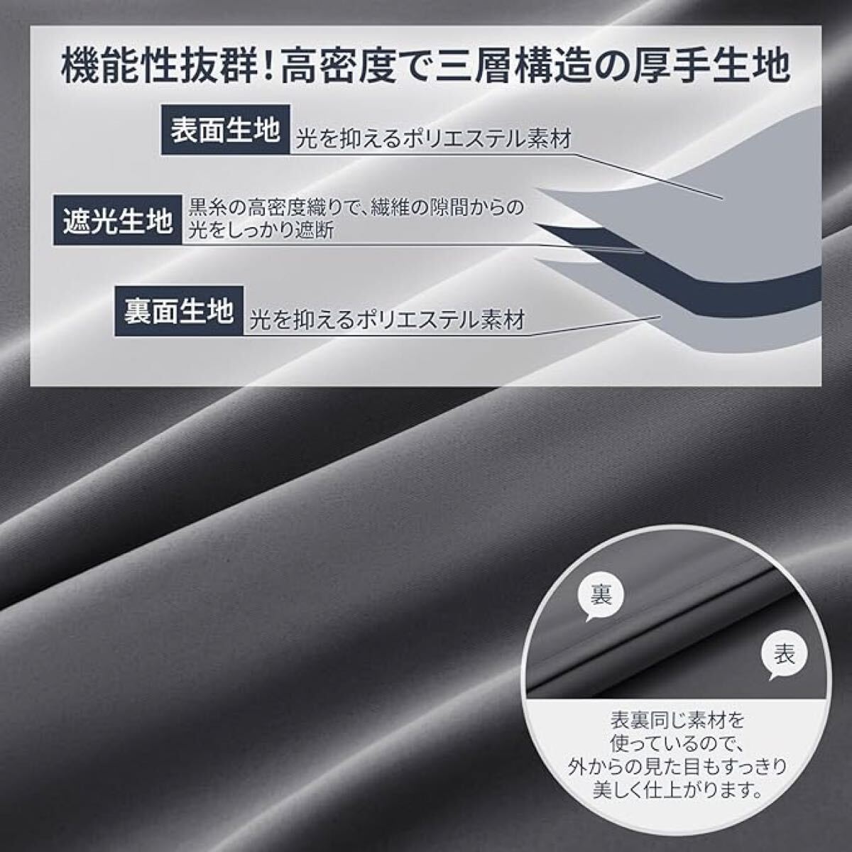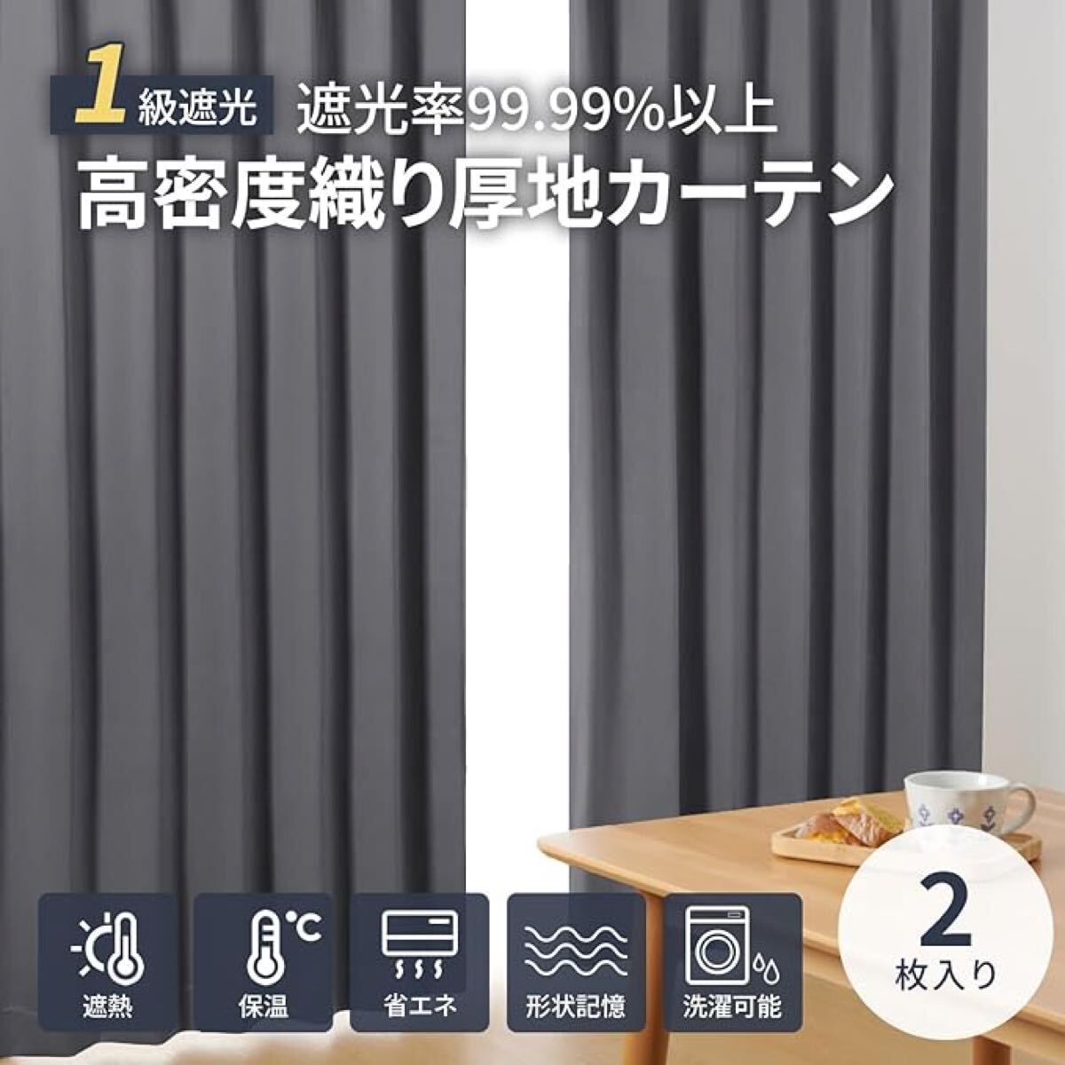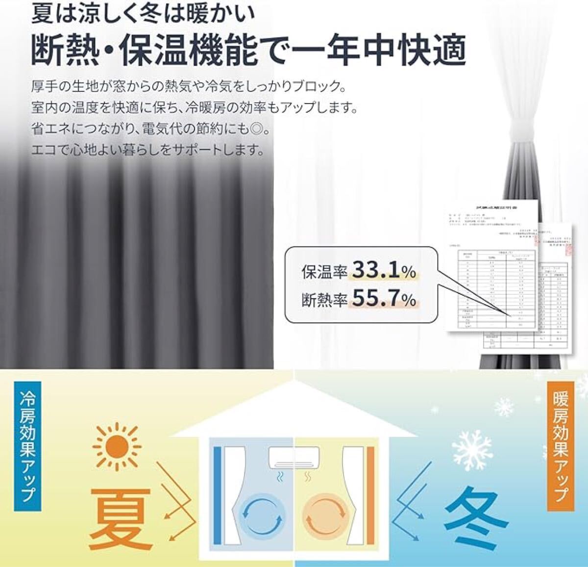 【断熱保温・省エネ】厚手の高密度生地が窓からの熱気や冷気をしっかり遮断し、夏は涼しく冬は暖かく快適に保ちます。室内の温度を一定に保つことで冷暖房の効率もアップし、電気代の節約にもつながります。エコで心地よい暮らしをサポートします。
