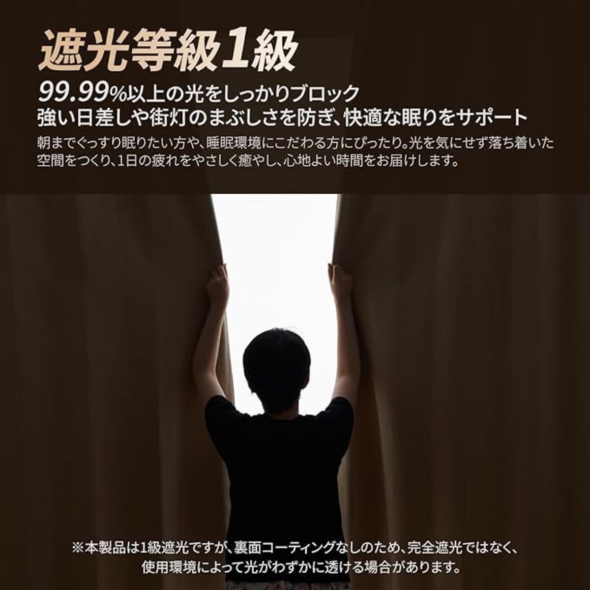 【1級遮光】遮光率99.99%以上で、強い日差しや街灯のまぶしさをしっかり防ぎます。黒糸の高密度織りにより繊維の隙間からの光も遮断し、昼間の映画鑑賞や在宅ワーク、快適な睡眠をサポートします。 ※浅色でも1級遮光の基準を満たしていますが、より高い遮光性を求める方には濃色がおすすめです。