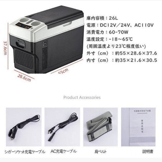 パッケージ内容:26L車載冷蔵庫本体、AC電源ケーブル、シガーソケット電源ケーブル、肩ベルト、説明書。