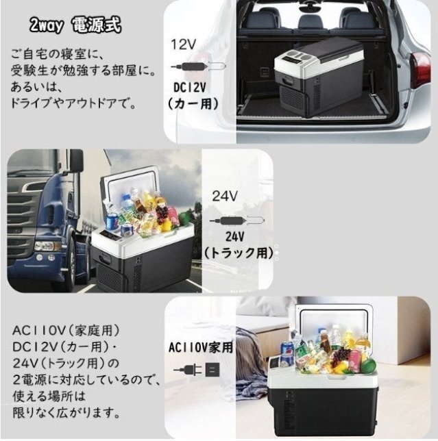 【AC / DC 2電源で室内も車載もOK】普段はお部屋で AC110v電源でお使いいただき、休日のレジャーでは車載の冷温ボックスとして DC12vのカー/24vのトラック電源で使用できます。