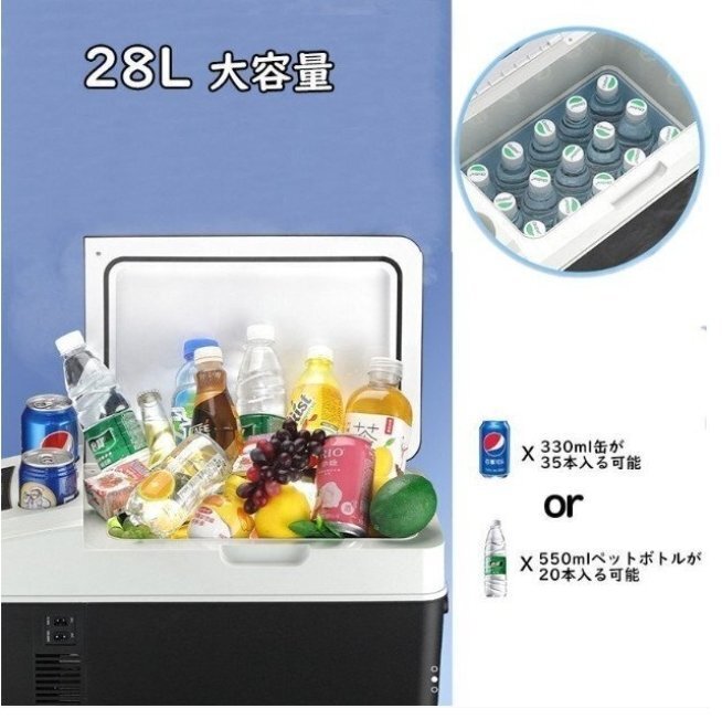 【26Lの大容量】この冷蔵庫は、内部に26Lの空間があり、普通は、330ml缶飲料35本や550mlペットボトル飲料20本を入れます。保冷剤やクールウェルなどを置く必要がないから、飲み物、化粧品のための空間にも余裕です。ショルダーストラップ付きで持ち運びも便利です。