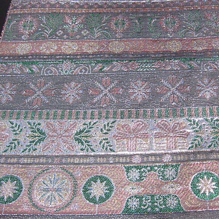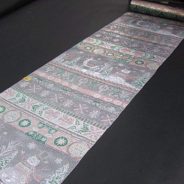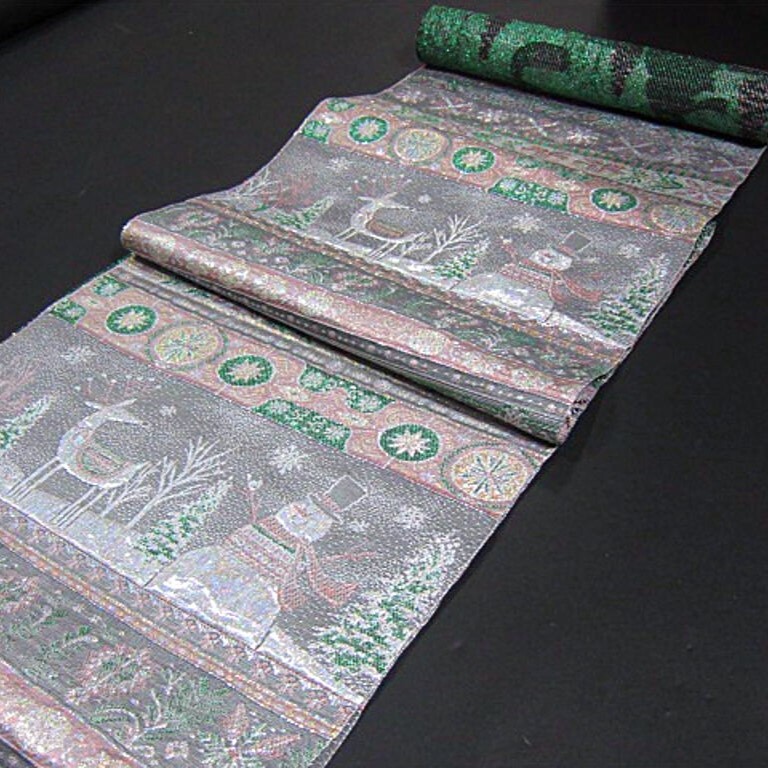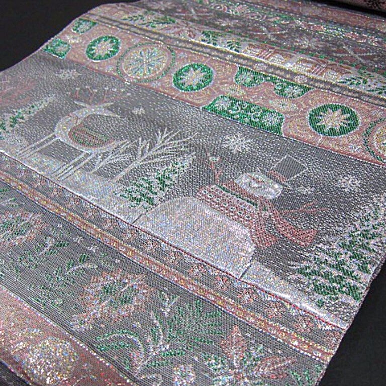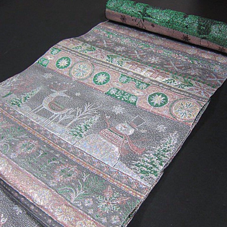 新品未仕立 西陣織九寸名古屋帯です。クリスマスの意匠が豪華に織りあげられております。クリエイティブなセンスあふれるひと品かと思います。パーティーなどにもいかがでしょうか。織り上がったばかりの袋帯になります。
