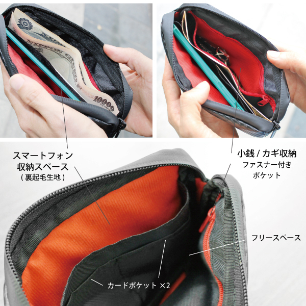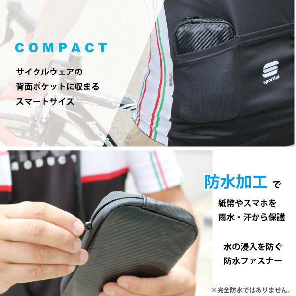 | 防水機能付き小銭、カード、スマホケース収納可能な防水ポーチ。 サイクリングウェアの背面ポケットに収まるスマートサイズです。 ・防水機能付きファスナーでポーチに入れた現金やスマホを濡らしません。 外部の雨水、熱による湿気や汗から保護します。 ※完全防水ではありません。 ・カードポケット、紙幣、小銭を入れて財布として 現金を折らずに収納できるのでかさばりません。 ・スマートフォンの画面を傷つけない裏地起毛スペースで 摩擦によるキズ付きを防止します。 内容 サイズ:横幅11 x高さ18.5 x厚み2.5 cm 重量:50g 材質:表地/ターポリン、裏地/ポリエステル起毛 デザイン:ブラックカーボン柄 | |