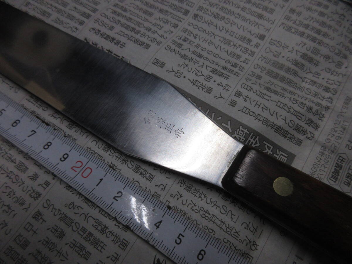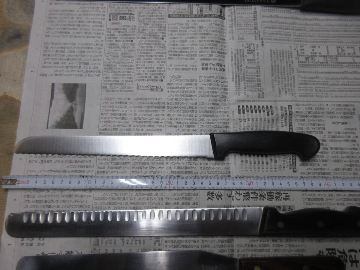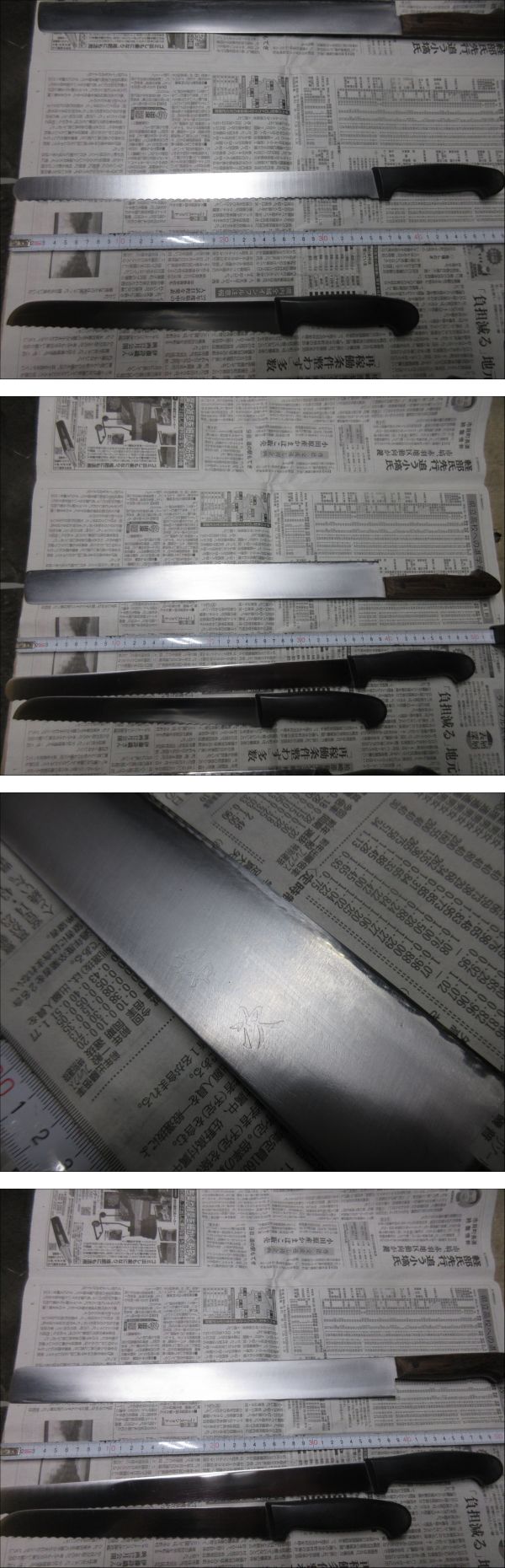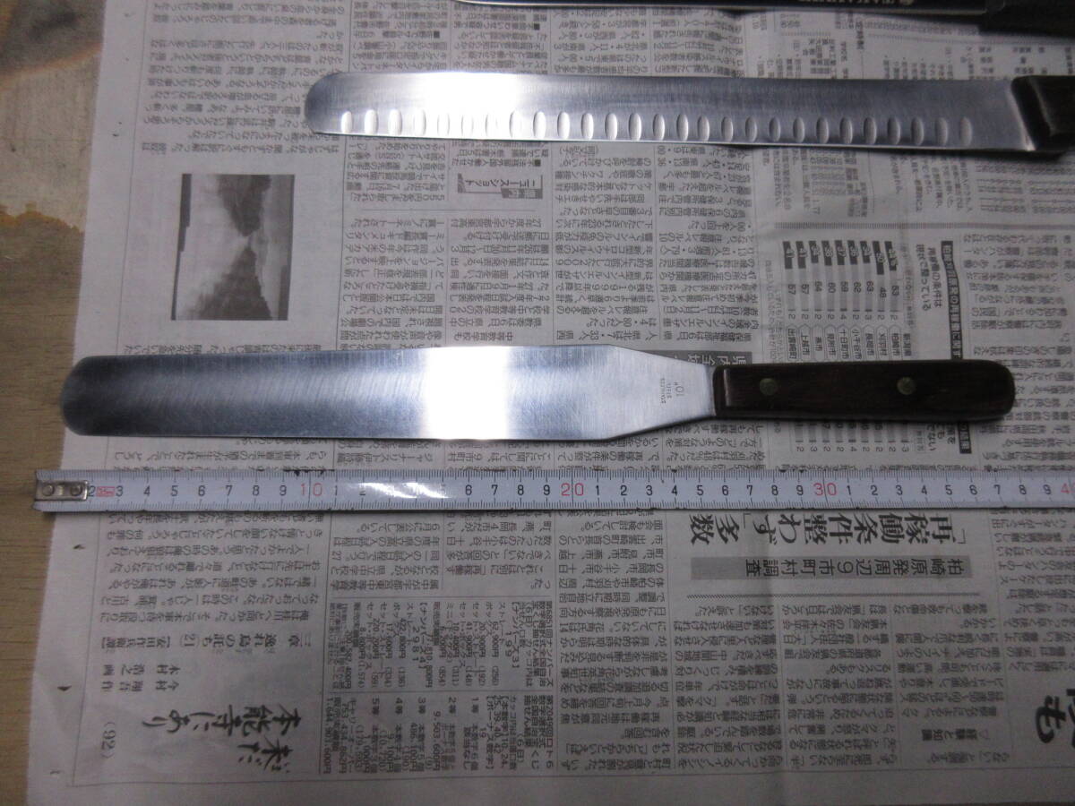 | 「受取連絡」が出来ない方の入札はお断りします。 こちらから評価を入れることはありません。 ■■■■■■■■■■■■■■■■■■■■■■■■■■■■■■■■■ 過去に入札が無かった売れ残りをまとめました。 銘が無いブレッドナイフは文明銀丁です。 歪みや反り、落としきれない錆があります。全体的に使用感があります。 包丁のみの出品です、付属品はありません。 ■■■■■■■■■■■■■■■■■■■■■■■■■■■■■■■■■ 発送は着払いゆうパック80サイズの予定です。(下記参照) 以下は定型文です。 洋包丁は両刃、和包丁は片刃を前提に出品しています。 (タイトルと個別情報に刃付けの記載が無ければ上記のとおりです) 他の出品物と同梱できます。(システム上、着払いとのまとめ依頼ができません。落札後に同梱希望のメッセージを頂ければ対応します。) 送料と材質についての質問には返答しません。 包丁につきましては全てジャンクとし、ノークレームノーリターンでお願いします。 出品からお品物が届くまでに時間が掛かった場合、鋼などの材質ですと変色や錆などの変質がある場合がございますのでご了承ください。 錆の酷い包丁は再生研磨していますが、あくまで素人仕事です。電動工具を用いての仕上げです。 削る、磨くは出来ますが歪みの修正は出来ません。中古品ですので歪みがある前提で入札してください。 磨きにより錆に強くなるメリットがありますが切った食材が張り付くデメリットがあります。 切れ味が悪いや、思ったより汚いなどのクレームはご遠慮ください。 触れば怪我をするほどの最低限の刃付けはしてあります、開封時にご注意ください。 肉眼での検品ですので微細な傷や欠けを見落としている可能性もありますので写真を参照してください。 現状維持のために防錆目的で椿油を塗布していることがありますので写真に不自然な艶が写っている時があります、ご了承ください。 (鋼の洋包丁の場合は中子にも塗布するために柄にも油が散布しています。ご使用前に洗浄してください。) 中子やリベットの錆を落とす為に柄ごと研磨する場合がありますので、柄に研磨痕が残っている時があります。 柄の仕上げに軽く蝋引きしています。 片刃の場合、研ぎですが砥石傷が付くのを嫌ってベタ研ぎはせず、峰をわずかに浮かして仕上げています。(綺麗な裏押しの和包丁はベタ研ぎです) 10対0ではなく9対1位の感覚です、完璧な片刃をお求めの方は入札をご遠慮ください。 (和包丁は片刃前提です、洋包丁が片刃の場合にはタイトルと個別情報に片刃と記載してあります) 有効利用、再生利用できる方の入札をおまちしています。 写真で判断いただき、商品説明を理解出来る方のみ入札をお願いします。 クリーニングなどはせず、写真のままお送りします。 専門知識が乏しい為、質問に答えられない時があります。 ブランド品の真偽については不明とさせて頂きます。 素人による中古出品です、すり替え防止の為にもノークレームノーリターンでお願いします。 入金を確認しました時点でお取り置き終了と判断し発送準備にはいります。 同梱発送、お取り置きを希望の方は入金前に連絡頂くと助かります。 落札後、48時間以内の初回連絡、五日以内の入金が確認出来ません場合は落札者様都合のキャンセルとさせて頂きます。 その場合落札者様に非常に悪い評価とブラックリストへの登録を同時に行いますのでご了承ください。 (以後こちらのオークションに入札が出来なくなります) #お取引に不安を感じる評価の方は削除させて頂く事があります。 #総合評価が高くても直近に悪い評価がある方も削除致します。 #いたずら入札を防ぐ為、1万円以上の入札額時の場合は新規の方の入札をお断りします。 #(どうしても入札したい時は質問欄より入札意思をお伝えください。) *評価を入れて頂くと反射的にお返しする形を取っています、不要の方は評価を入れないで下さい。 *こちらから評価をお付けすることはありません、不要の方は「受取連絡」で終了して下さい。 自己紹介欄もあわせてお読みください。 | ||
