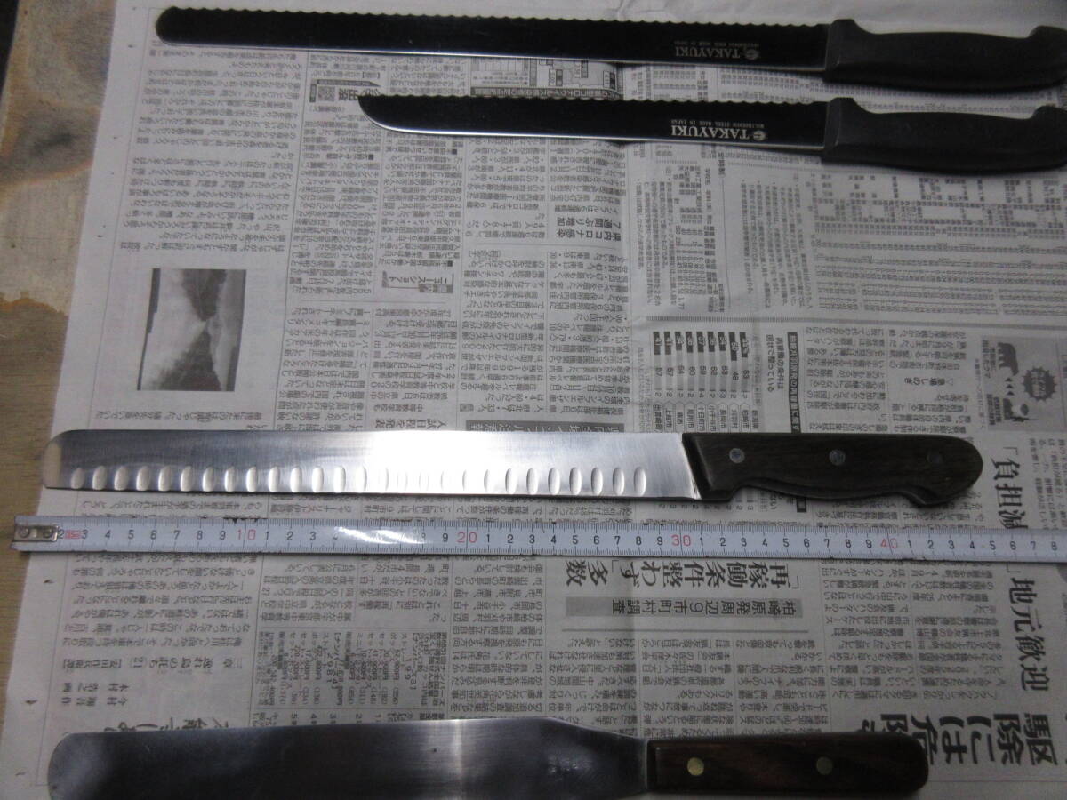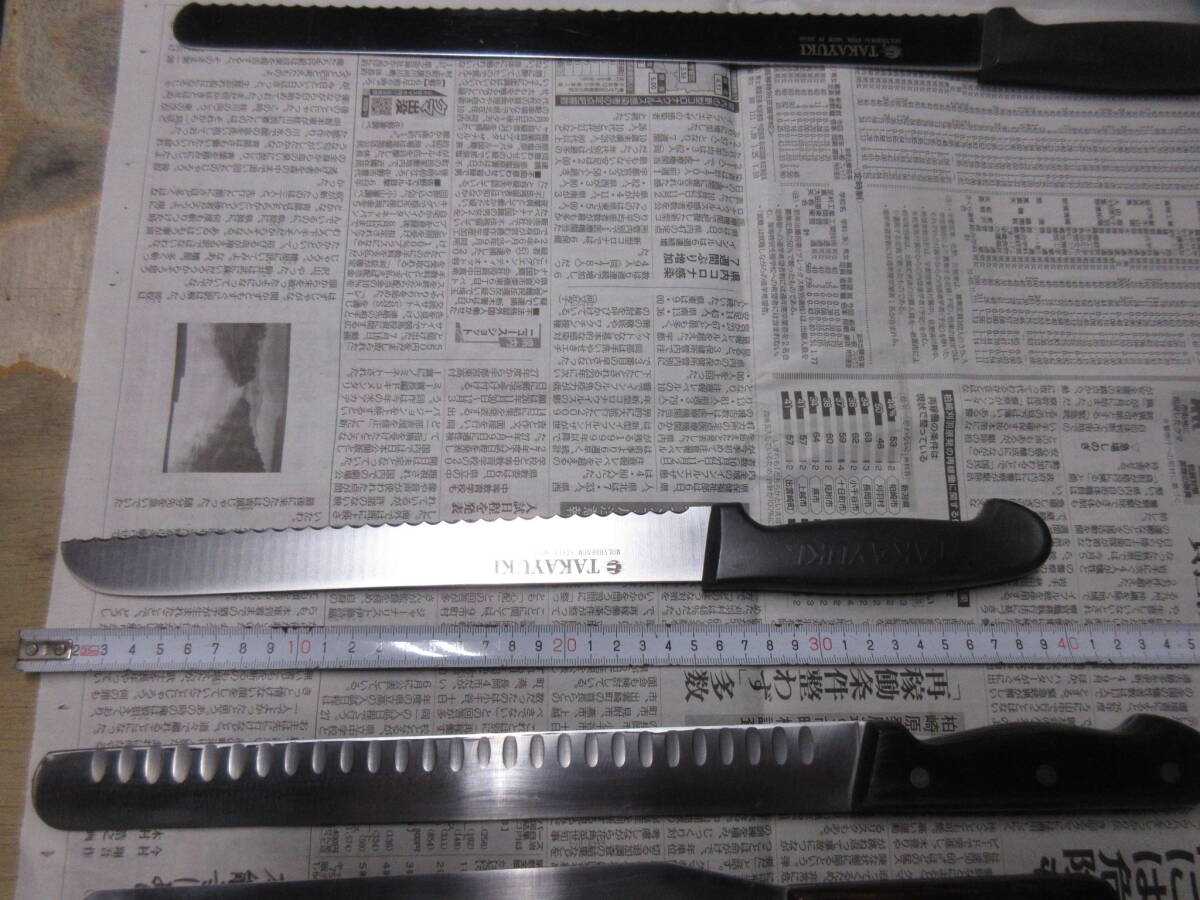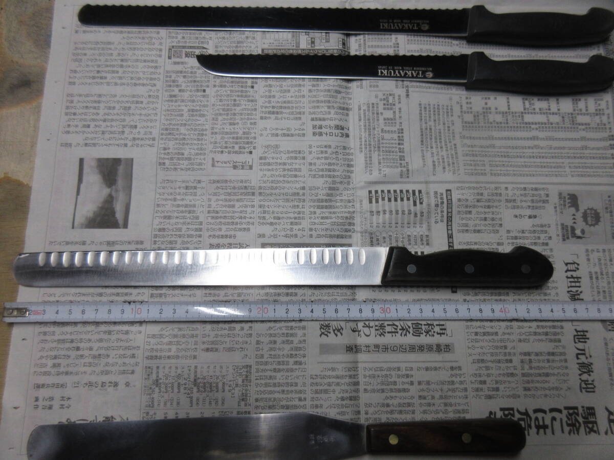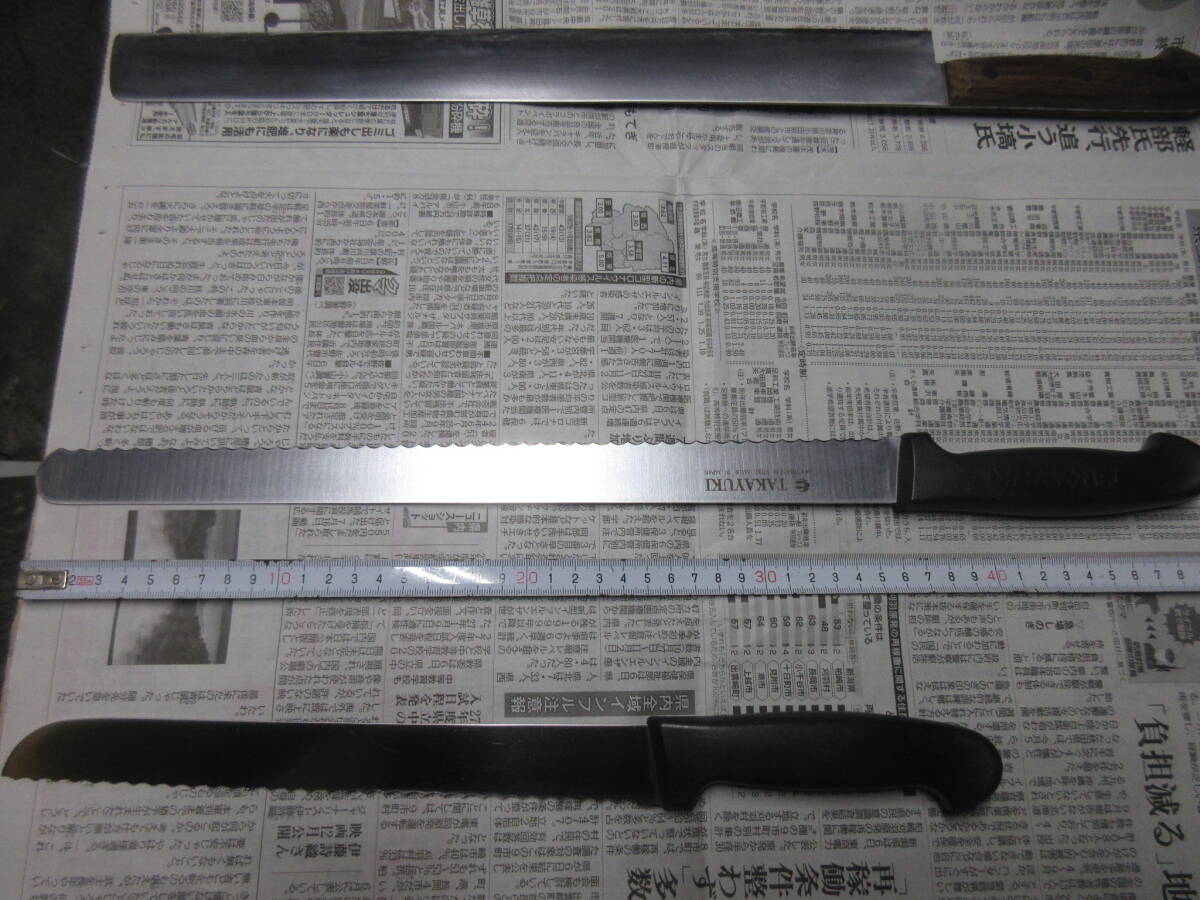 | 「受取連絡」が出来ない方の入札はお断りします。 こちらから評価を入れることはありません。 ■■■■■■■■■■■■■■■■■■■■■■■■■■■■■■■■■ 過去に入札が無かった売れ残りをまとめました。 銘が無いブレッドナイフは文明銀丁です。 歪みや反り、落としきれない錆があります。全体的に使用感があります。 包丁のみの出品です、付属品はありません。 ■■■■■■■■■■■■■■■■■■■■■■■■■■■■■■■■■ 発送は着払いゆうパック80サイズの予定です。(下記参照) 以下は定型文です。 洋包丁は両刃、和包丁は片刃を前提に出品しています。 (タイトルと個別情報に刃付けの記載が無ければ上記のとおりです) 他の出品物と同梱できます。(システム上、着払いとのまとめ依頼ができません。落札後に同梱希望のメッセージを頂ければ対応します。) 送料と材質についての質問には返答しません。 包丁につきましては全てジャンクとし、ノークレームノーリターンでお願いします。 出品からお品物が届くまでに時間が掛かった場合、鋼などの材質ですと変色や錆などの変質がある場合がございますのでご了承ください。 錆の酷い包丁は再生研磨していますが、あくまで素人仕事です。電動工具を用いての仕上げです。 削る、磨くは出来ますが歪みの修正は出来ません。中古品ですので歪みがある前提で入札してください。 磨きにより錆に強くなるメリットがありますが切った食材が張り付くデメリットがあります。 切れ味が悪いや、思ったより汚いなどのクレームはご遠慮ください。 触れば怪我をするほどの最低限の刃付けはしてあります、開封時にご注意ください。 肉眼での検品ですので微細な傷や欠けを見落としている可能性もありますので写真を参照してください。 現状維持のために防錆目的で椿油を塗布していることがありますので写真に不自然な艶が写っている時があります、ご了承ください。 (鋼の洋包丁の場合は中子にも塗布するために柄にも油が散布しています。ご使用前に洗浄してください。) 中子やリベットの錆を落とす為に柄ごと研磨する場合がありますので、柄に研磨痕が残っている時があります。 柄の仕上げに軽く蝋引きしています。 片刃の場合、研ぎですが砥石傷が付くのを嫌ってベタ研ぎはせず、峰をわずかに浮かして仕上げています。(綺麗な裏押しの和包丁はベタ研ぎです) 10対0ではなく9対1位の感覚です、完璧な片刃をお求めの方は入札をご遠慮ください。 (和包丁は片刃前提です、洋包丁が片刃の場合にはタイトルと個別情報に片刃と記載してあります) 有効利用、再生利用できる方の入札をおまちしています。 写真で判断いただき、商品説明を理解出来る方のみ入札をお願いします。 クリーニングなどはせず、写真のままお送りします。 専門知識が乏しい為、質問に答えられない時があります。 ブランド品の真偽については不明とさせて頂きます。 素人による中古出品です、すり替え防止の為にもノークレームノーリターンでお願いします。 入金を確認しました時点でお取り置き終了と判断し発送準備にはいります。 同梱発送、お取り置きを希望の方は入金前に連絡頂くと助かります。 落札後、48時間以内の初回連絡、五日以内の入金が確認出来ません場合は落札者様都合のキャンセルとさせて頂きます。 その場合落札者様に非常に悪い評価とブラックリストへの登録を同時に行いますのでご了承ください。 (以後こちらのオークションに入札が出来なくなります) #お取引に不安を感じる評価の方は削除させて頂く事があります。 #総合評価が高くても直近に悪い評価がある方も削除致します。 #いたずら入札を防ぐ為、1万円以上の入札額時の場合は新規の方の入札をお断りします。 #(どうしても入札したい時は質問欄より入札意思をお伝えください。) *評価を入れて頂くと反射的にお返しする形を取っています、不要の方は評価を入れないで下さい。 *こちらから評価をお付けすることはありません、不要の方は「受取連絡」で終了して下さい。 自己紹介欄もあわせてお読みください。 | ||