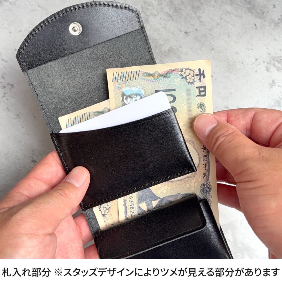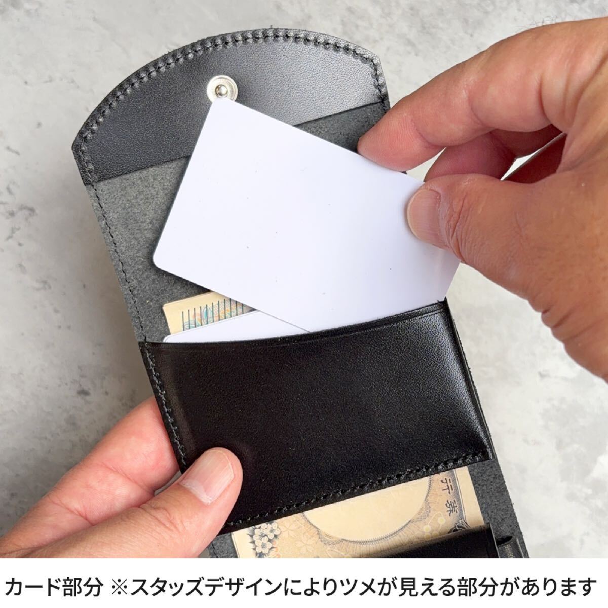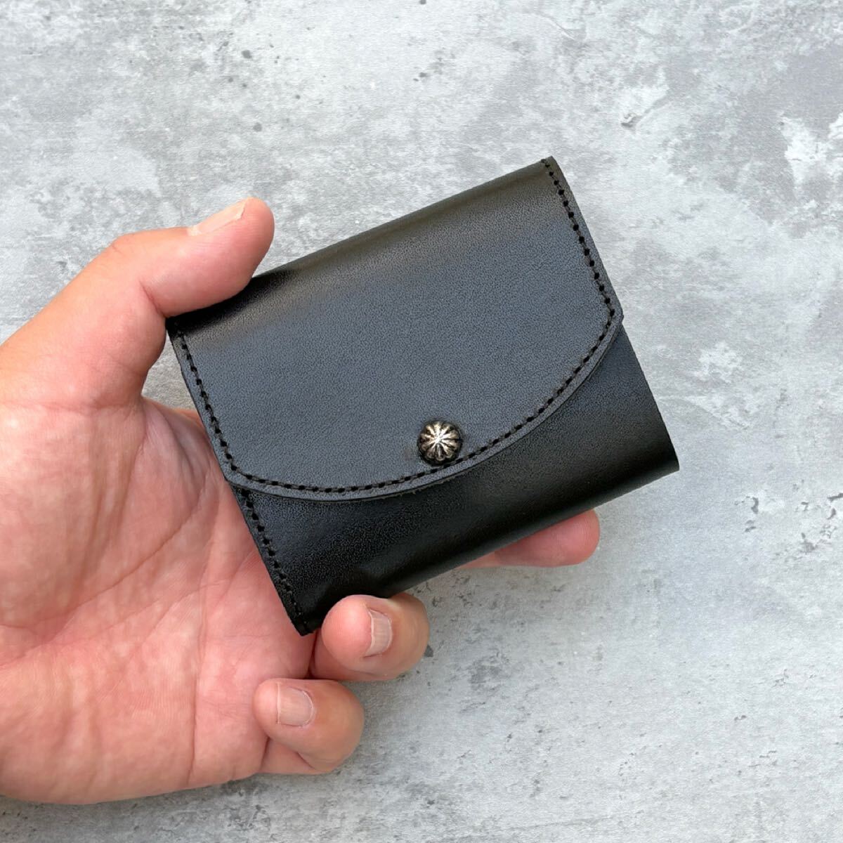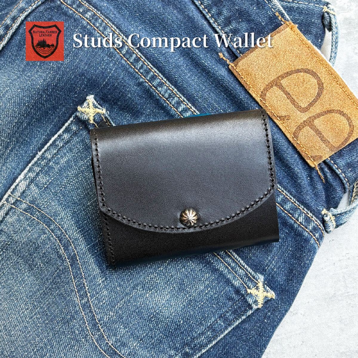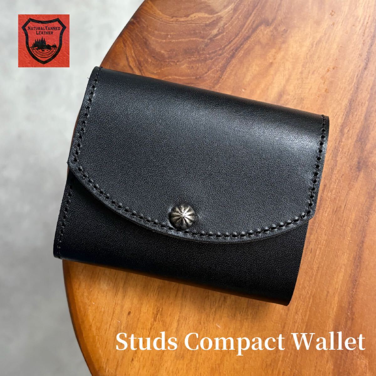 栃木レザーを使用した、手のひらサイズの三つ折りコンパクト財布にアメリカのスタッズをカスタムしました。