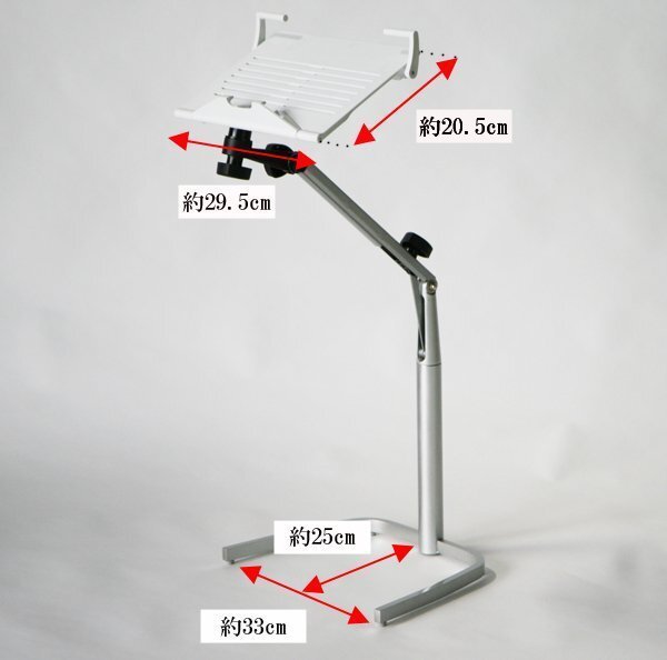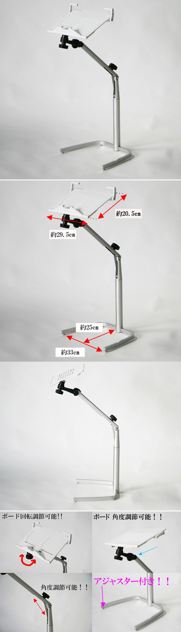 | 商品紹介 | ●スペースを取らないラップトップテーブルです。 ●ボードは、360度回転調節可能で、角度調節も無段階にでき、 お好みに合わせて自由に調節が可能!! ●自分にピッタリのラップトップテーブルとしてお使い頂けます。 ●PCパソコンなどを置いてスムーズに作業ができます。 ●アジャスター付きです。 ◆こちらの商品は、組立式です。 ≪材質≫ プラスチックパネル、アルミニウム、スチール |