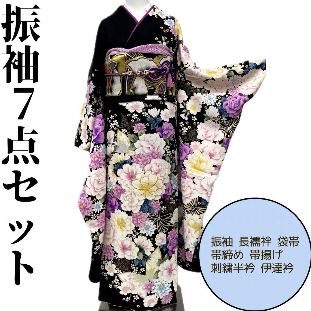振袖・長襦袢・袋帯・帯締め・帯揚げ・刺繍半衿・伊達襟の必要な物は全て揃った7点セットです。
